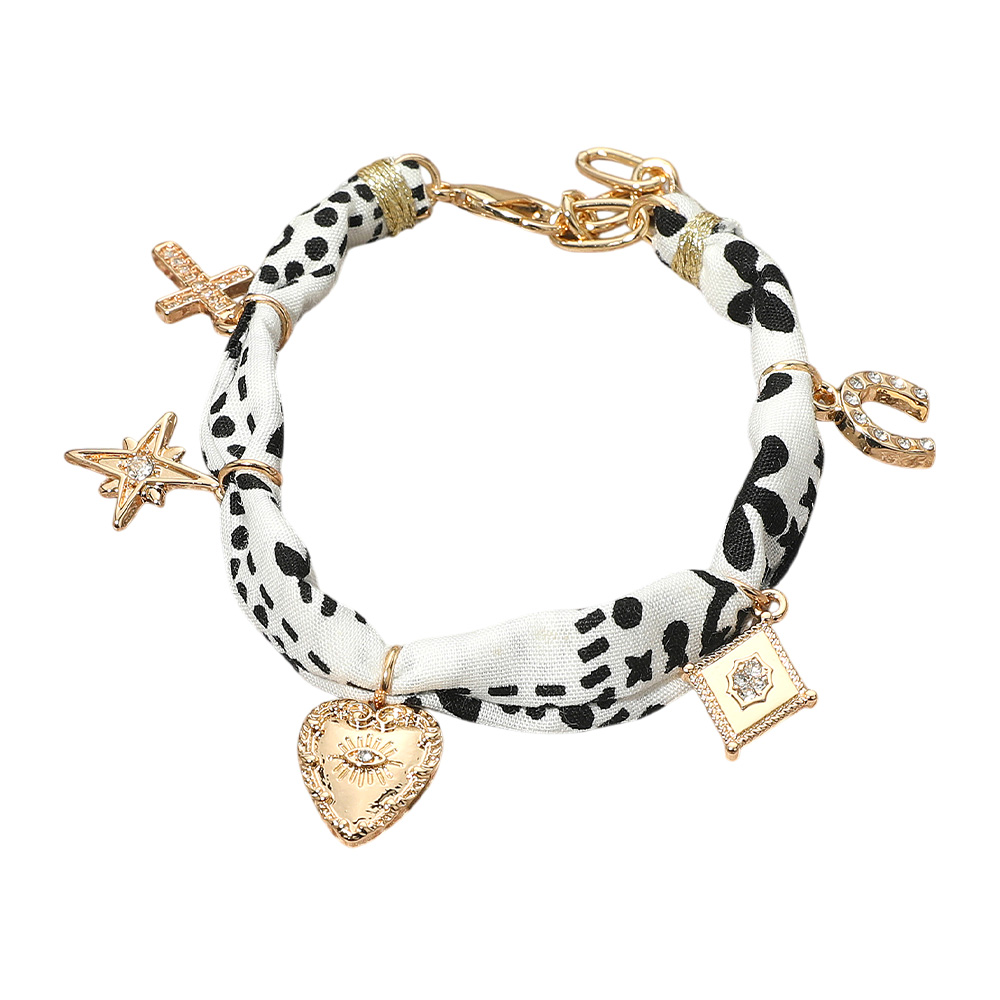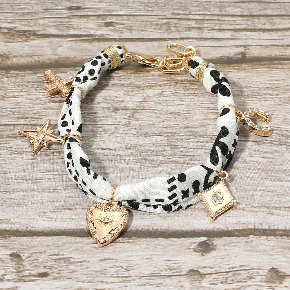 Details • Size : 1" H, 7.5" + 1.5" L • Lobster Clasp Closure • Stylish fabric-wrapped bracelet adorned with assorted charms including a horseshoe, cross, star, heart, and decorative medallion. Perfect for adding a whimsical bohemian touch to casual and festival looks. • Lead and Nickel Compliant