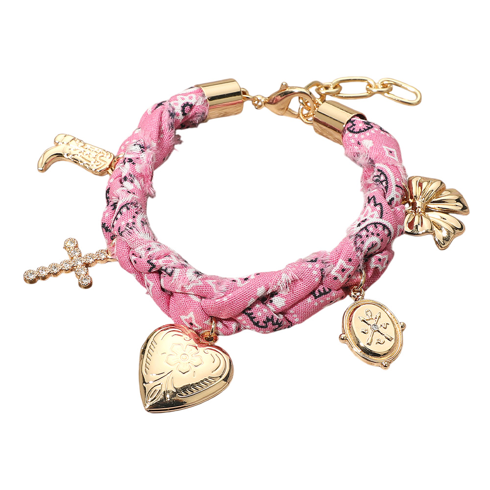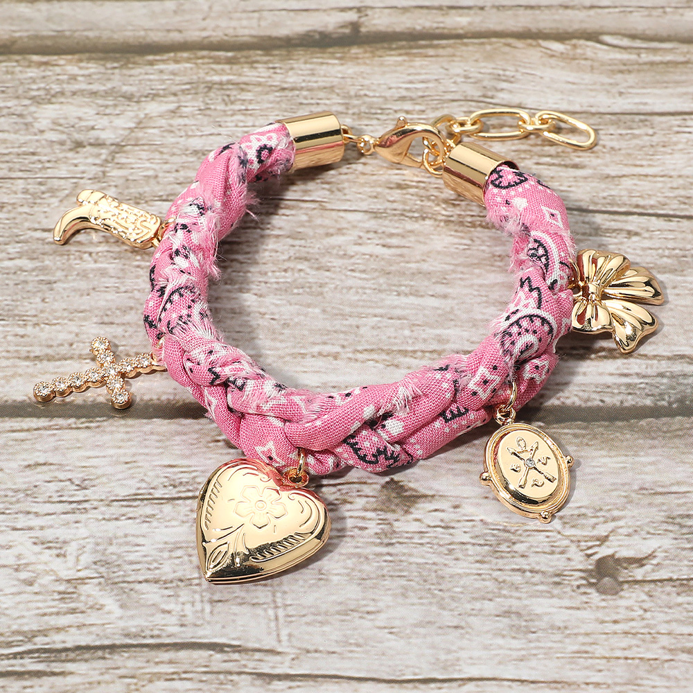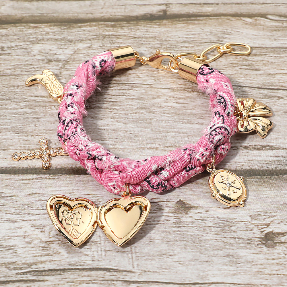 Boho Heart Locket Bow Cross Charm Station Fabric Bracelet