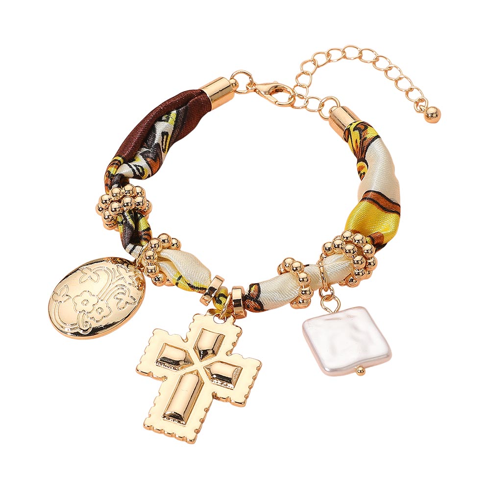 Details • Size : 0.5" H, 7" + 2" L • Charm Size : 1.5" L • Lobster Clasp Closure • Pattern May Vary • Elevate your accessory style with this Charm Pendant Fabric Bracelet, featuring a braided fabric band adorned with gold-tone beads, a cross pendant, and chic charm accents. A perfect blend of modern design and timeless elegance, ideal for both casual and statement looks • Lead and Nickel Compliant