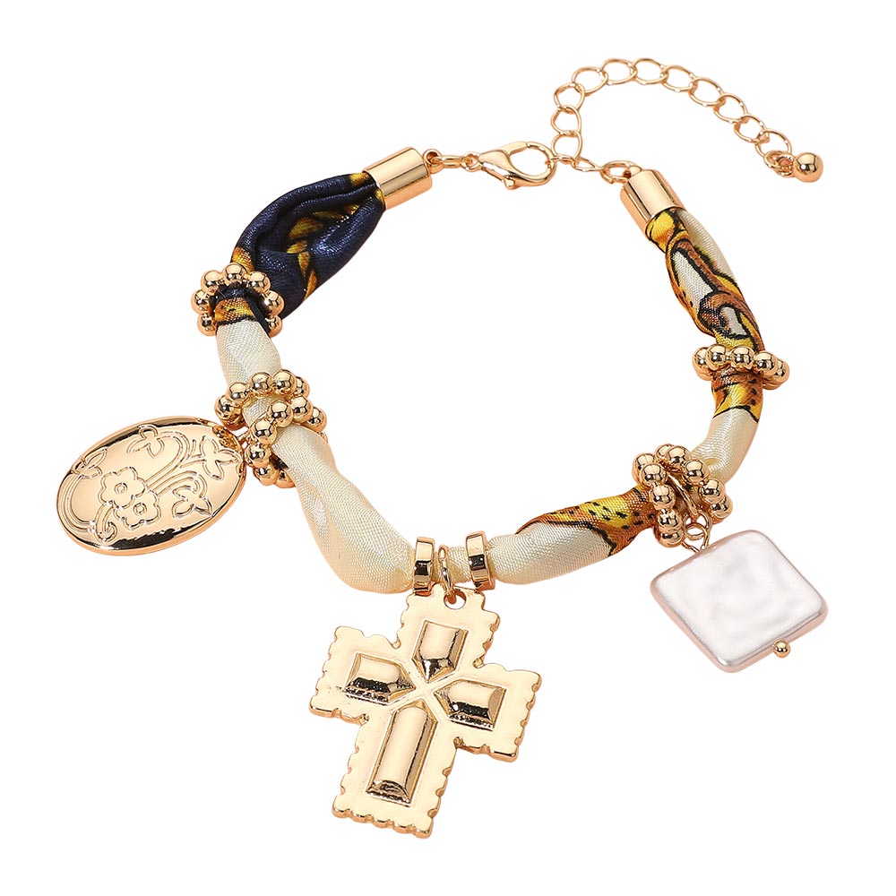• Elevate your accessory style with this Charm Pendant Fabric Bracelet, featuring a braided fabric band adorned with gold-tone beads, a cross pendant, and chic charm accents. A perfect blend of modern design and timeless elegance, ideal for both casual and statement looks
