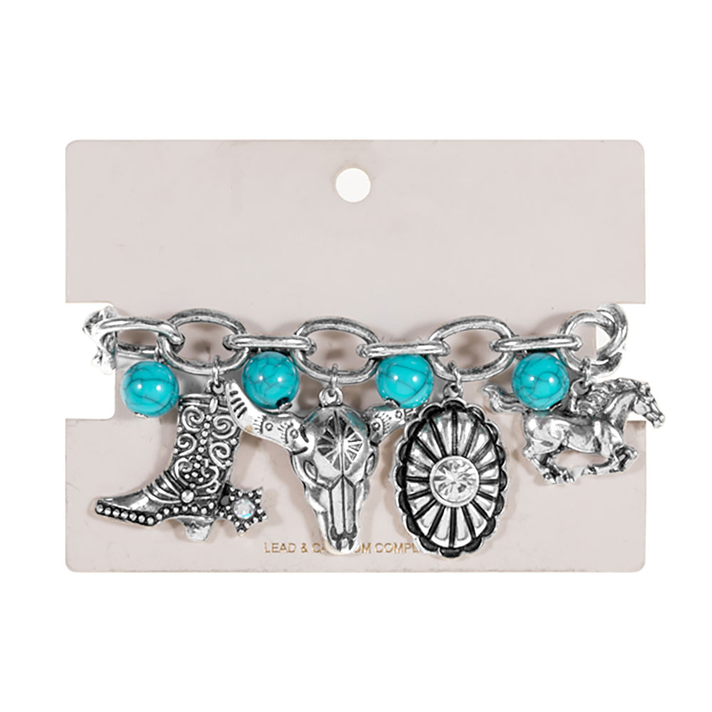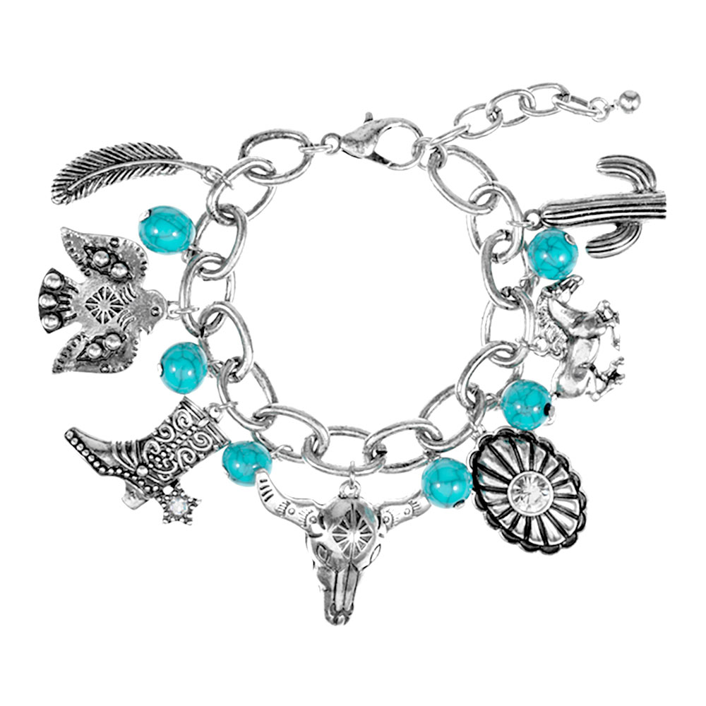 Details • Size : 0.5" H, 7.5" + 2" L • Charm Size : 1.25" L • Lobster Clasp Closure • Statement link bracelet featuring bold hanging motifs inspired by frontier style, designed to add character to everyday outfits or special occasions. Ideal for stacking, gifting, festivals, casual wear, and collectors seeking a distinctive accessory that stands out with playful charm detailing. • Lead and Nickel Compliant