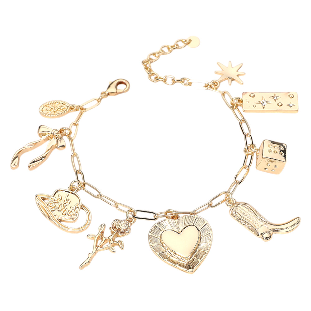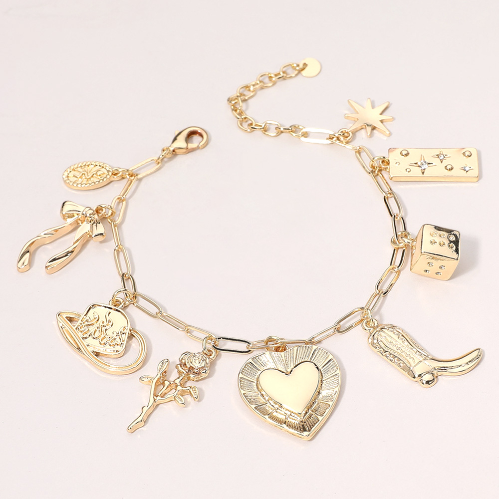 Metal Bow Cowboy Hat Boot Rose Heart Dice Charm Station Paperclip Chain Bracelet