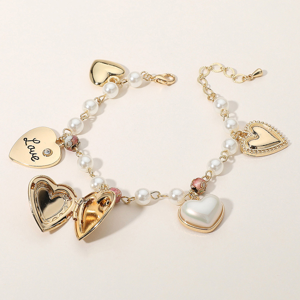 Details • Size : 1.1" H, 6.5" + 2" L • Lobster Clasp Closure • Adorn your wrist with this elegant charm bracelet featuring heart-shaped pendants, pearl accents, and a delicate “Love” engraving. Its timeless design captures romance and sophistication, making it a perfect accessory for both everyday wear and special occasions. • Lead and Nickel Compliant
