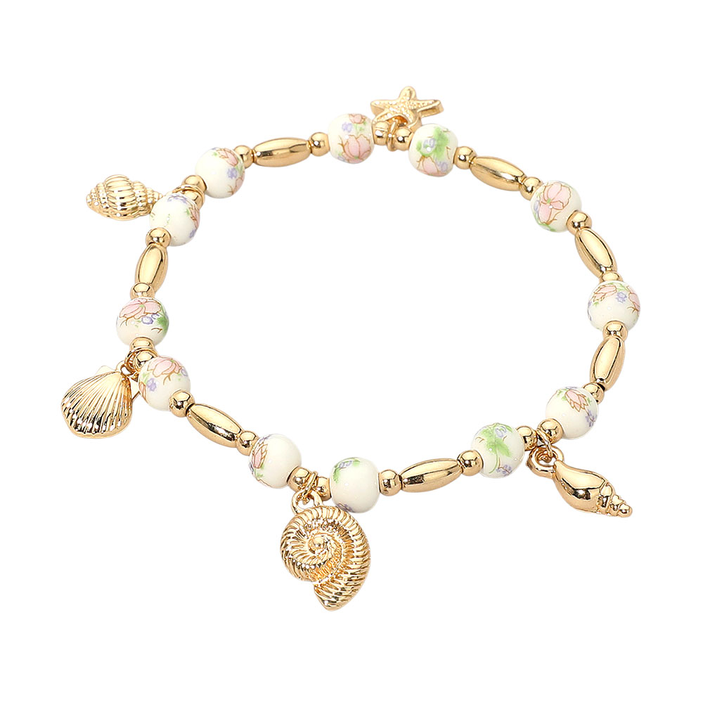Metal Shell Puka Shell Starfish Charm Station Ceramic Ball Beaded Stretch Bracelet