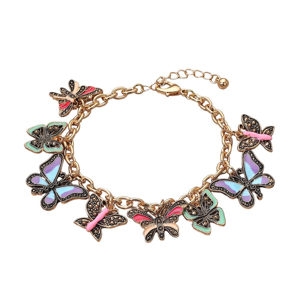 Details • Size : 0.2" H, 7.75" + 1.75" L • Charm Size : 0.75" L • Lobster Clasp Closure • Charming butterfly bracelet featuring multiple pendants with colorful accents and intricate detailing. A whimsical accessory that adds elegance and playful beauty to any outfit, perfect for nature lovers and those who enjoy unique jewelry with a touch of personality and vibrant flair. • Lead and Nickel Compliant