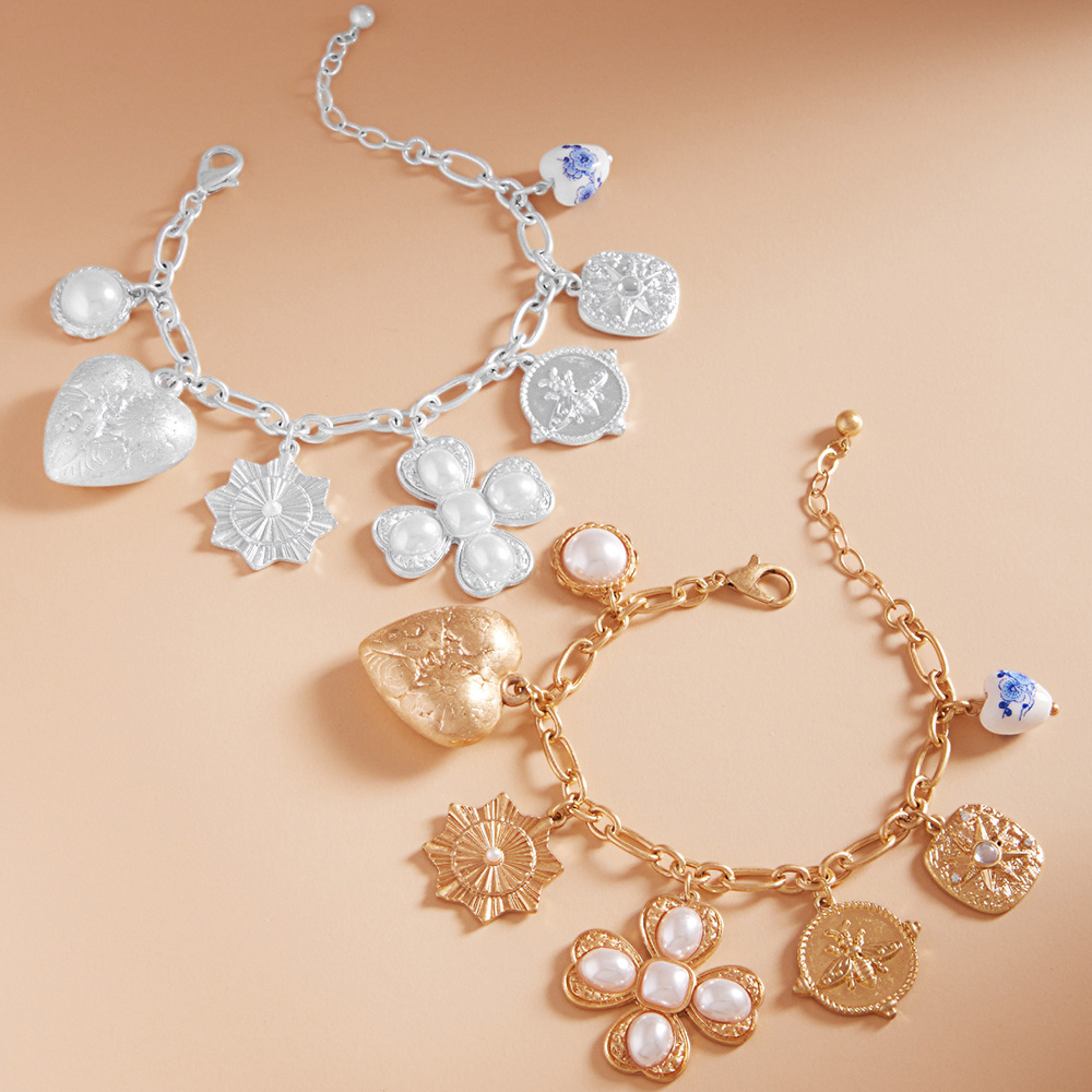 Pearl Clover Metal Heart Honey Bee Medal Charm Station Bracelet
