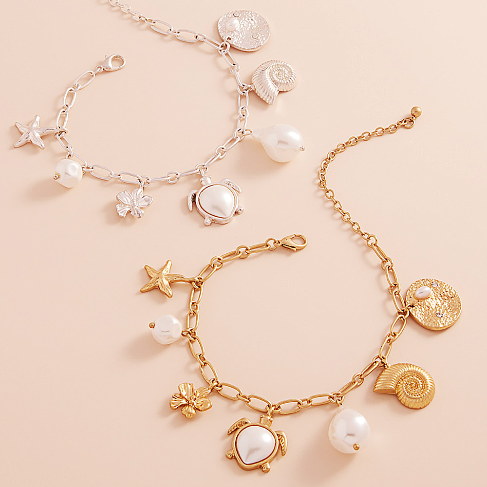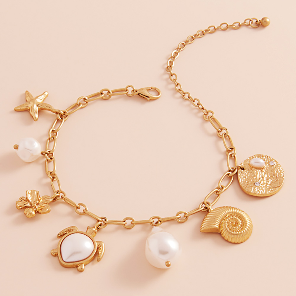 Details • Size : 1" H , 8" + 3" L • Lobster Clasp Closure • Embrace coastal elegance with this sea life charm bracelet adorned with ocean motifs like a turtle, shell, and star. A delicate accessory perfect for beach lovers and ocean-inspired styling. • Lead and Nickel Compliant