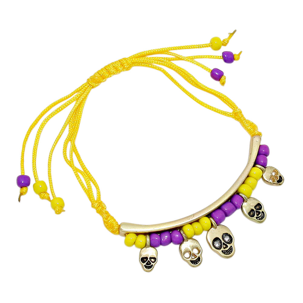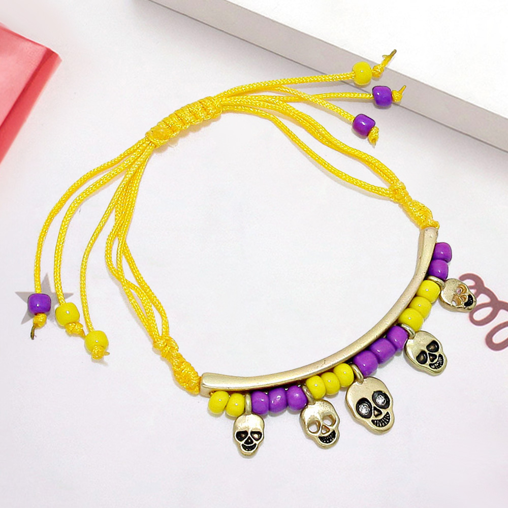 Details • Size : 0.5" H • Adjustable • Adjustable cord bracelet with vibrant beads and dangling skull charms, offering a playful yet edgy design. Perfect for casual wear, themed outfits, or Halloween accessories that make a bold style statement. • Lead and Nickel Compliant