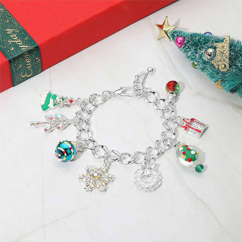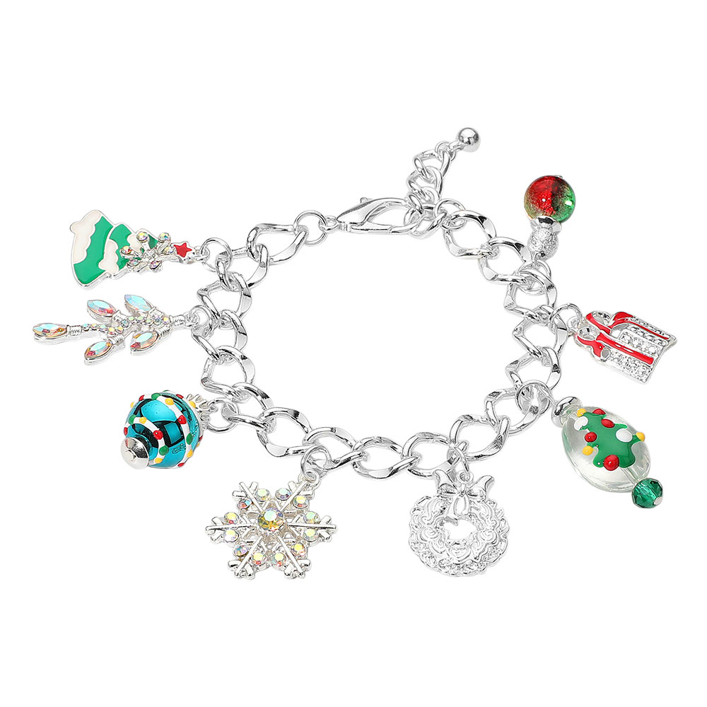 Details • Size : 0.4" H, 7.5" + 1" L • Charm Size : 1" L • Lobster Clasp Closure • Celebrate the season with this festive Christmas charm bracelet featuring playful holiday pendants including a tree, snowflake, wreath, and gift. A joyful accessory that adds sparkle and cheer to your look, perfect for gifting or enhancing holiday outfits. • Lead and Nickel Compliant
