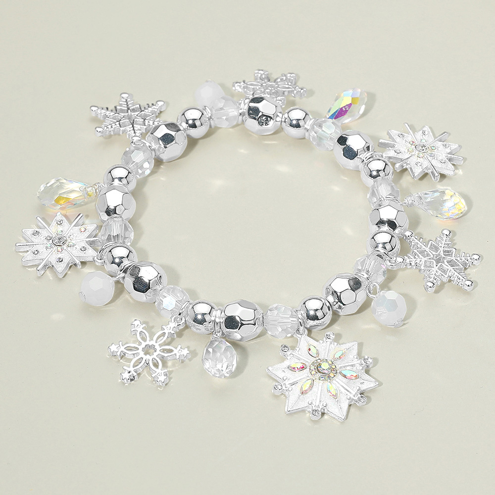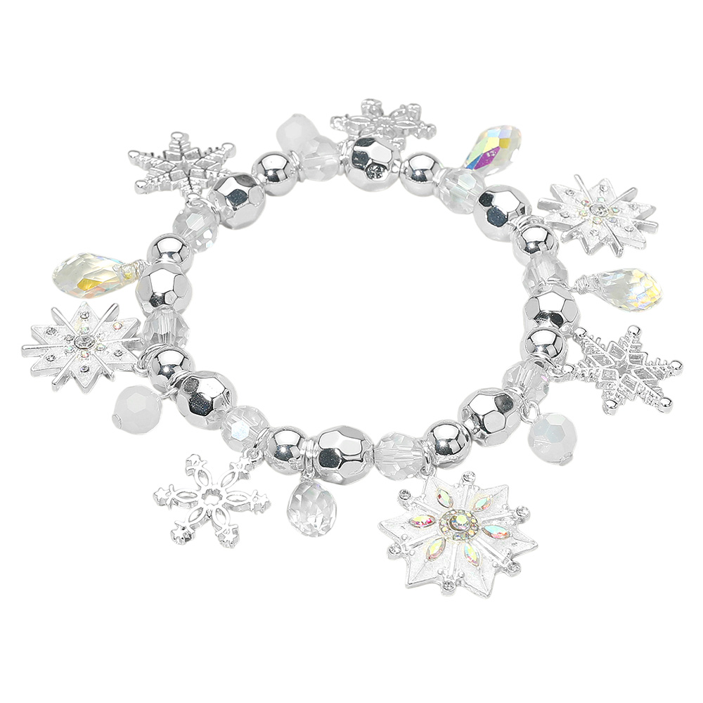 Details • Size : 0.4" H • Charm Size : 1" L • Stretchable • Add a touch of winter magic to your style with this snowflake charm stretch bracelet, featuring shimmering beads and sparkling accents. A festive accessory that blends elegance with seasonal charm, perfect for holiday wear or gifting someone special. • Lead and Nickel Compliant