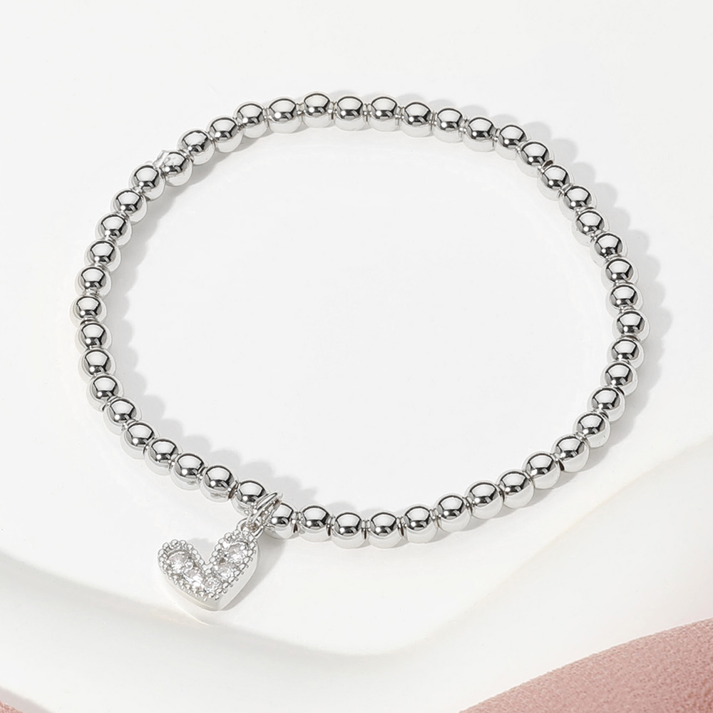 Stainless Steel Ball Heart Charm Beaded Stretch Bracelet