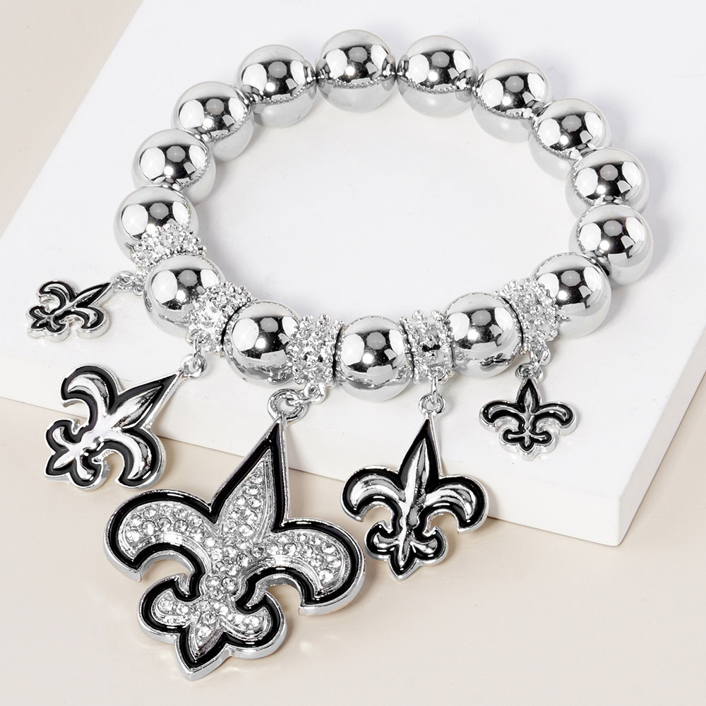 Stone Embellished Fleur de Lis Charm Metal Ball Stretch Bracelet