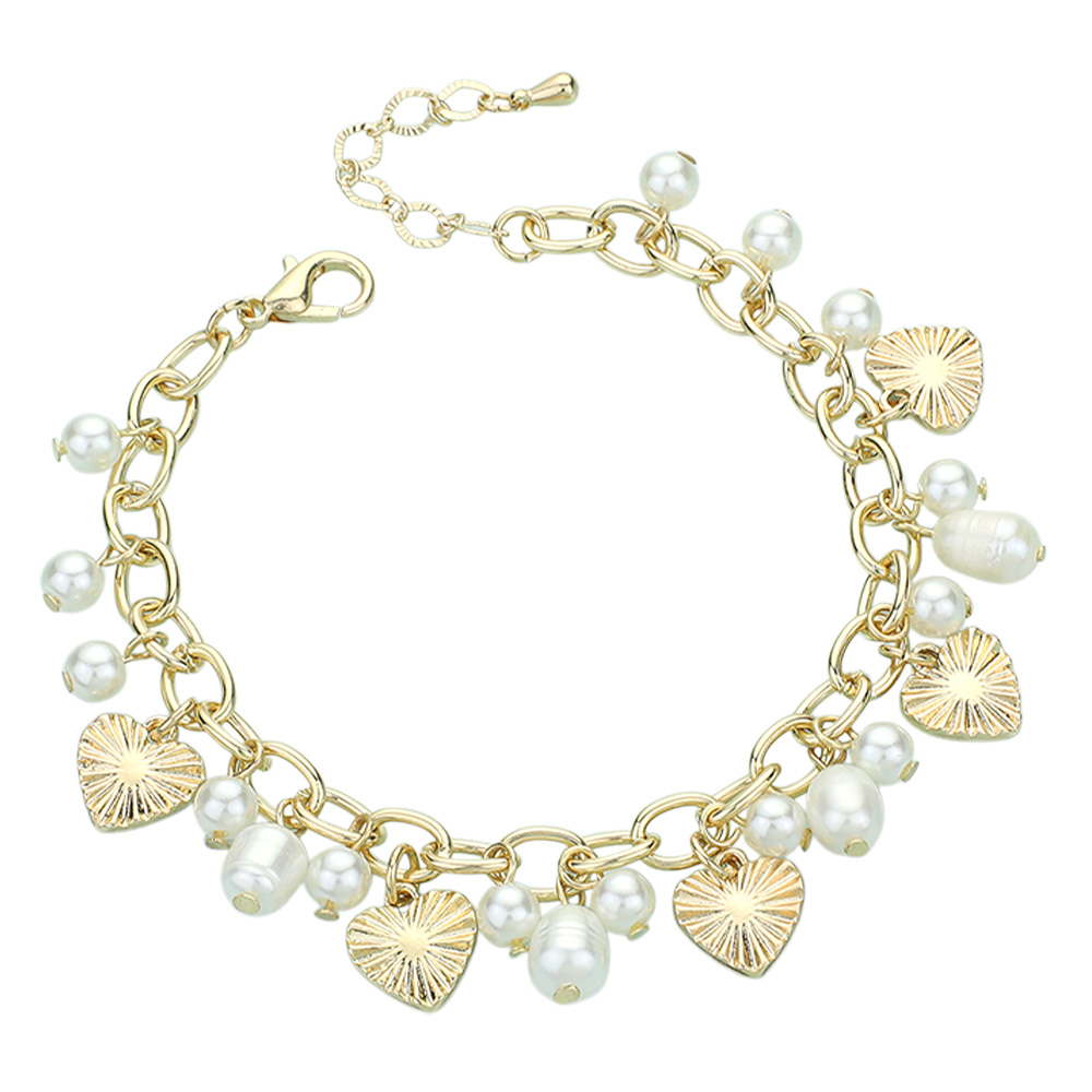 Textured Metal Heart Pearl Charm Chain Bracelet