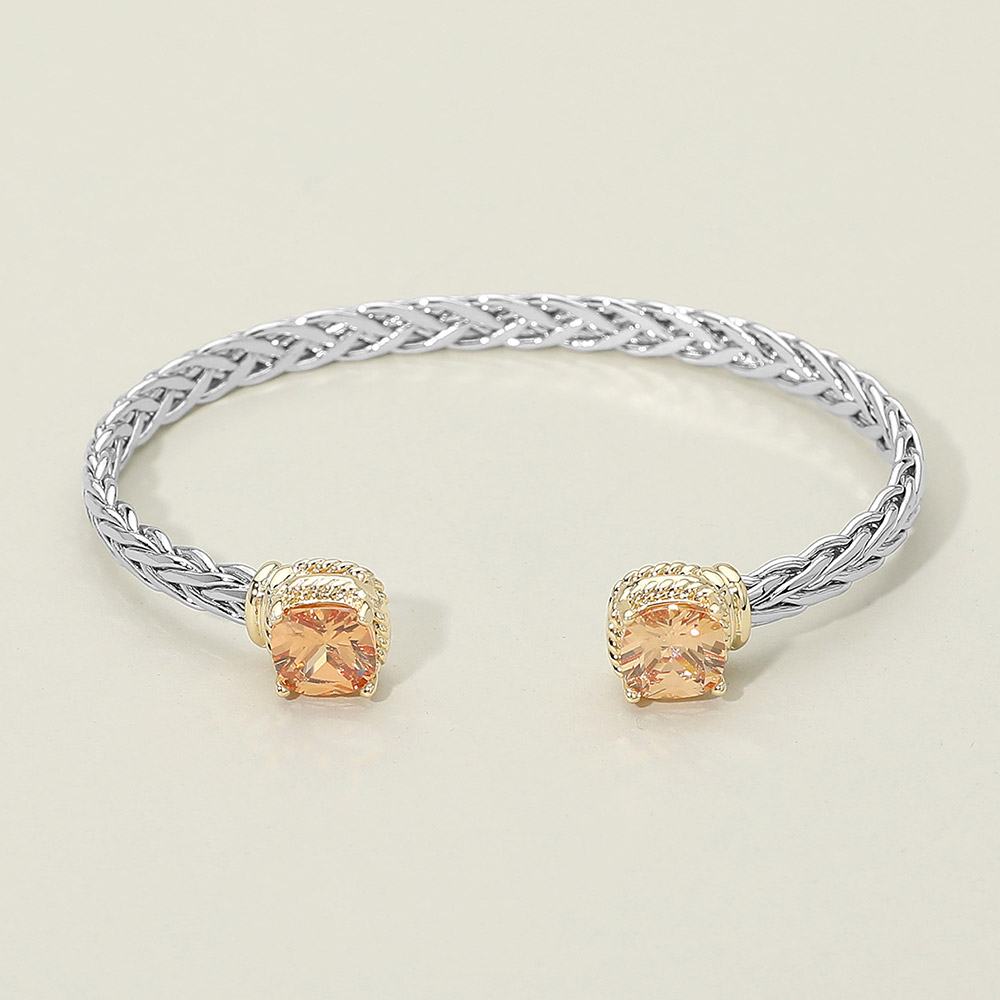 • Refined open cuff bracelet featuring a braided band and square crystal end details. Designed with a structured silhouette and elegant sparkle, this versatile accessory pairs effortlessly with casual or dress looks and layers beautifully with other bracelets for curated styling.