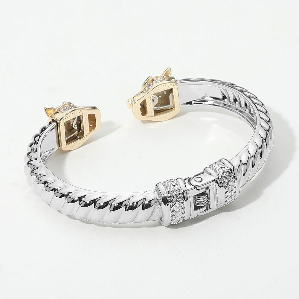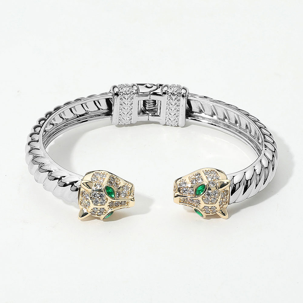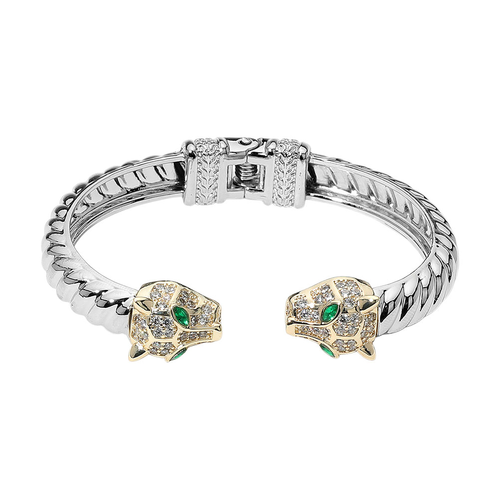 Details • Size : 0.5" H, 2.6" D • Hinged Closure • Make a powerful statement with this panther head bracelet, featuring striking details and sparkling accents. Designed for strength and elegance, this bold accessory adds a touch of luxury and edge to both casual and formal looks. • CZ Cubic Zirconia • Gold Dipped