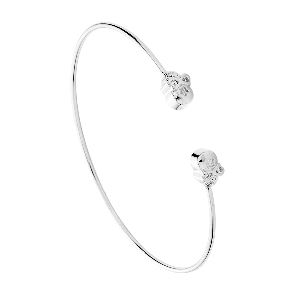 Details • Size : 0.25" H • Cuff • Stylish skull cuff bracelet with an open bangle design, featuring dual skull accents for a bold statement. Lightweight and versatile, perfect for layering or wearing alone to showcase edgy and modern style. • Lead and Nickel Compliant • Brass • CZ Cubic Zirconia
