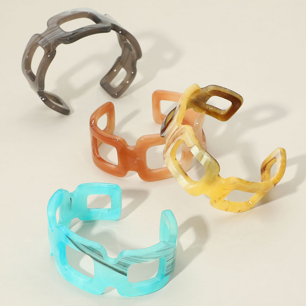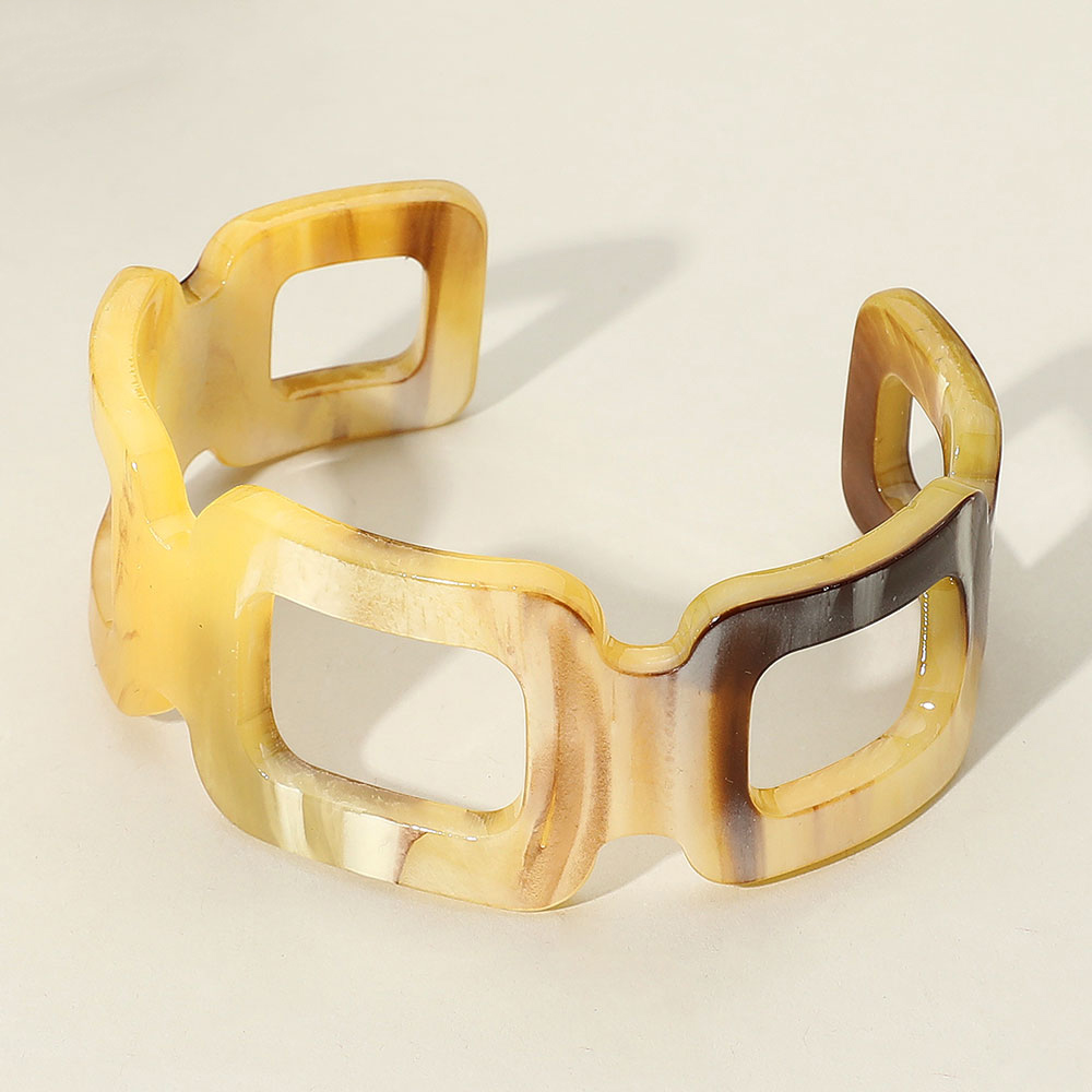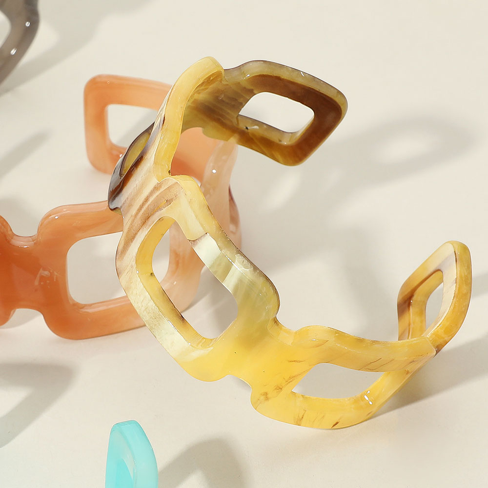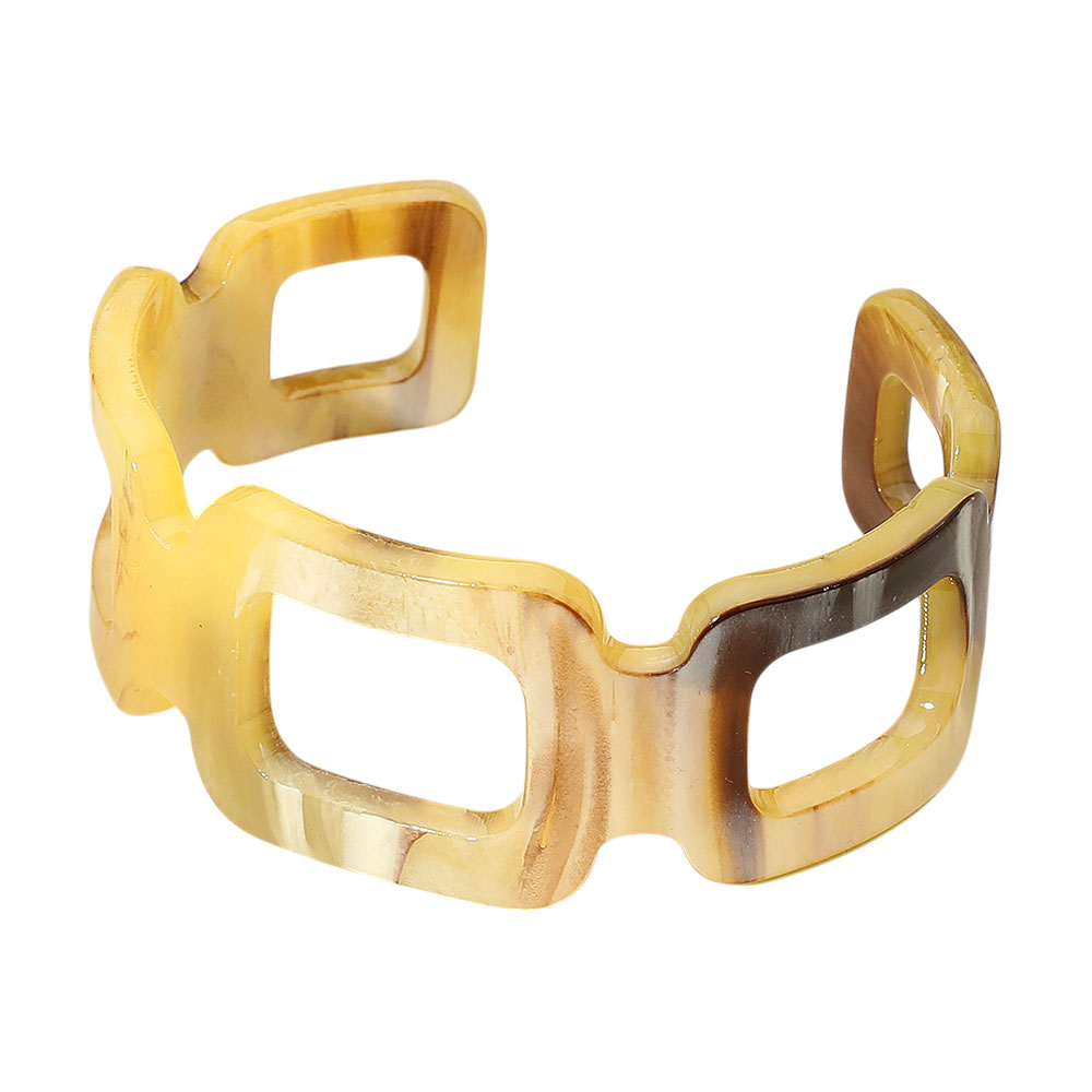 Details • Size : 1.25" H, 2.6" D • Cuff • Make a modern style statement with this geometric cutout cuff bracelet, featuring a marbled finish for added depth and texture. Perfect for pairing with casual or dressy looks, offering a bold accessory that blends contemporary design with artistic flair.