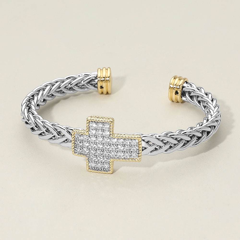 CZ Stone Paved Cross Accent Two Tone Braided Cuff Bracelet CZ Stone Paved Cross Accent Two Tone Braided Cuff Bracelet