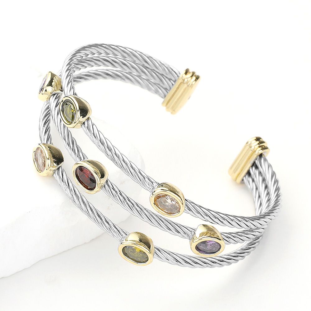 CZ Stone Paved Oval Pointed Triple Cable Split Cuff Bracelet
