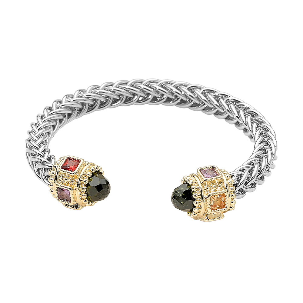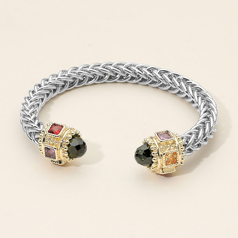 • This intricately braided cuff bracelet features gemstone-inspired end caps framed by ornate detailing for a touch of luxury. Its open design offers easy wear while the refined craftsmanship blends classic charm with a modern edge, ideal for elevated everyday style.
