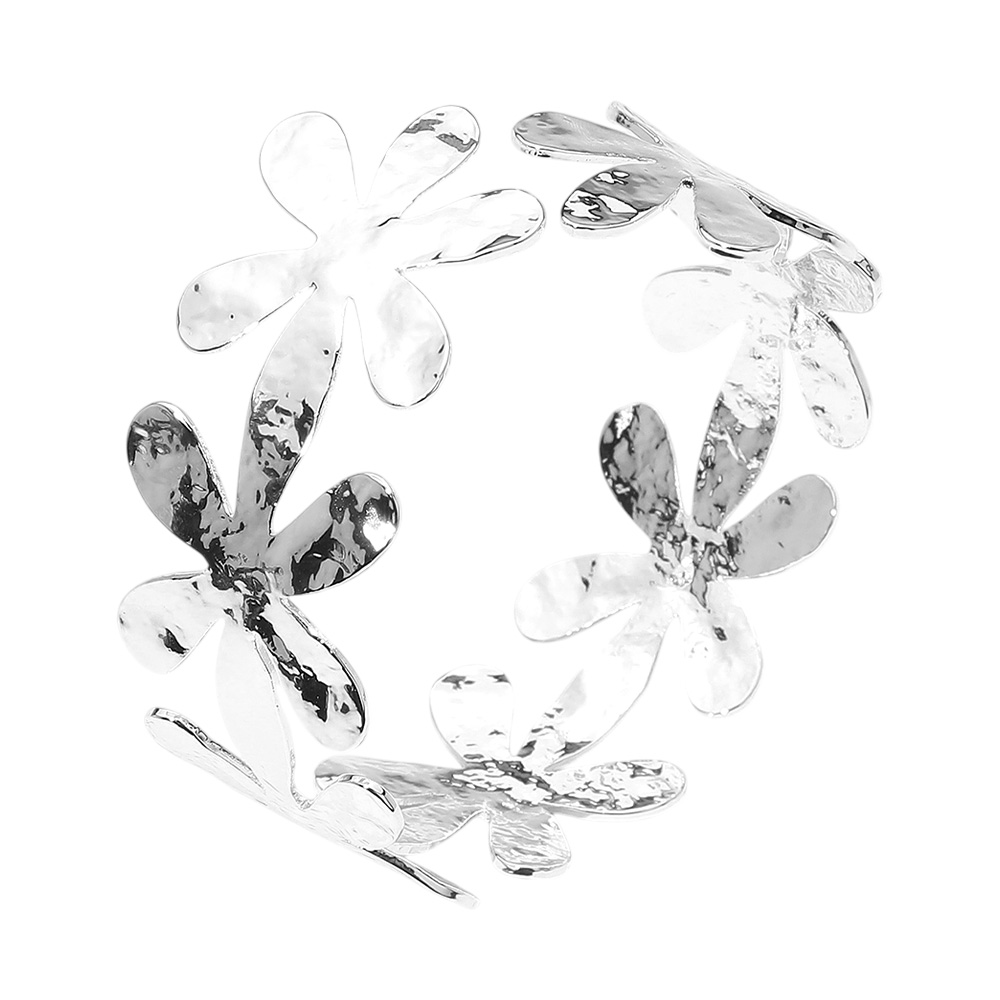 Details • Size : 1.1" H, 2.4" D • Cuff • A bold cuff bracelet featuring oversized hammered metal flower cutouts with an open design. Lightweight yet eye-catching, this piece adds a playful and modern touch to casual or dressy looks. Available in metallic finishes for versatile styling. • Lead and Nickel Compliant