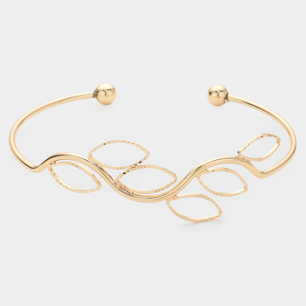 • Elevate your accessory game with this open cuff bracelet featuring a graceful leaf motif. Its minimalist design adds a touch of nature-inspired elegance to any look, perfect for both casual and formal styling.
