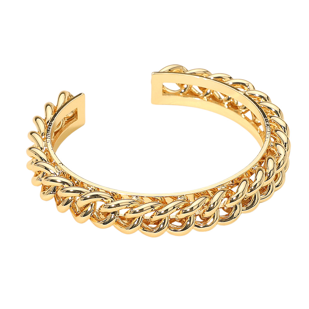 • Stylish open cuff bracelet featuring a bold chain link design, perfect for adding a modern edge to any look. This statement accessory offers a sleek and trendy finish, ideal for stacking or wearing solo for a refined yet impactful style.