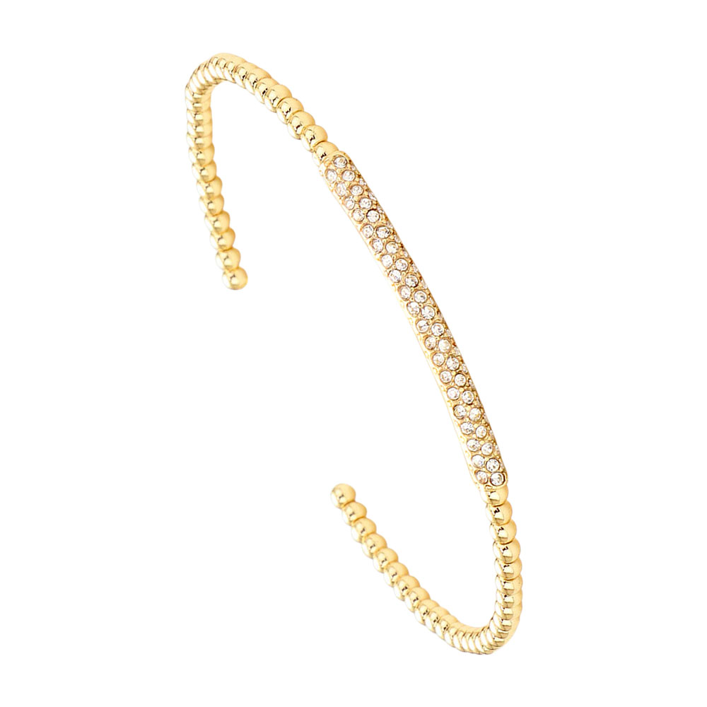 Details • Size : 0.15" H • Cuff • Add modern sophistication to your style with this open cuff bracelet featuring a delicate beaded design and sparkling crystal bar centerpiece. Perfect for stacking or wearing solo, this timeless piece transitions seamlessly from daywear to evening elegance. • Lead and Nickel Compliant