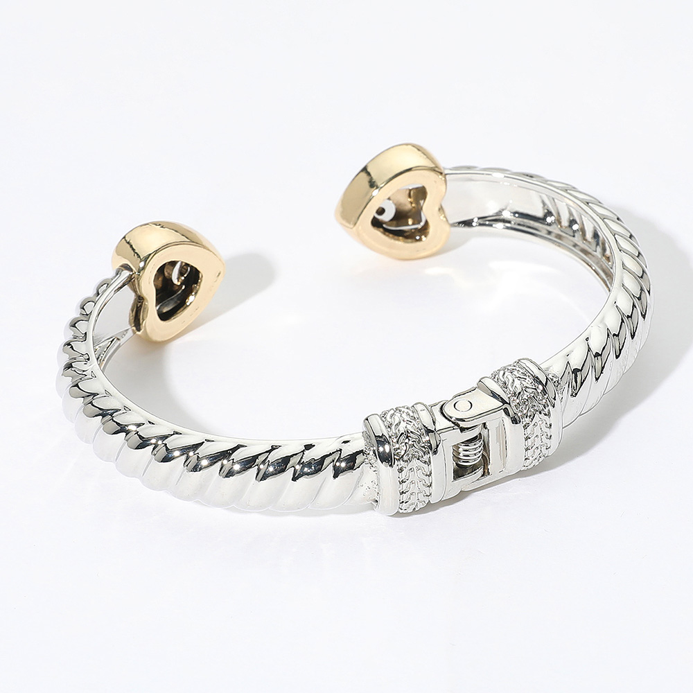 Details • Size : 0.6" H, 2.6" C • Cuff / Hinged Closure • Add timeless elegance to your jewelry collection with this two-tone cuff bracelet featuring gold-edged heart accents and ribbed detailing for a refined finish.