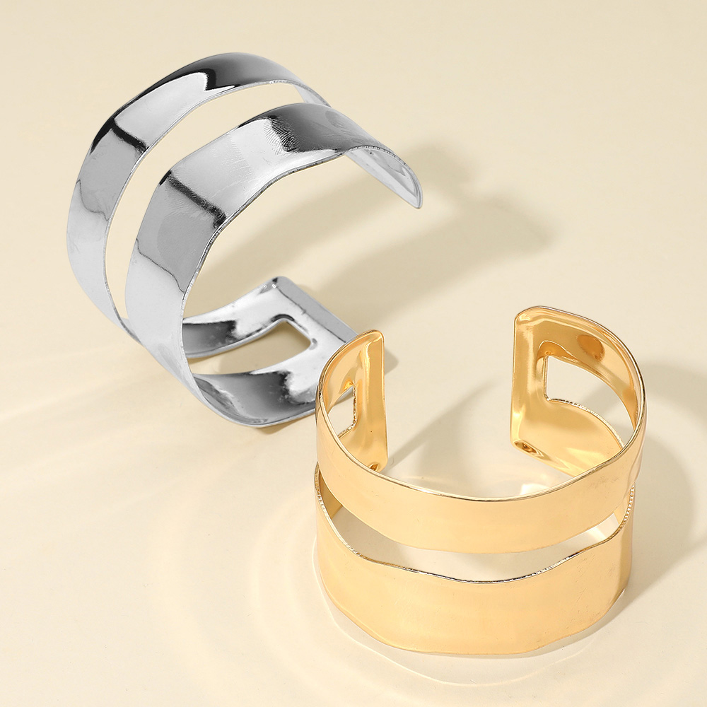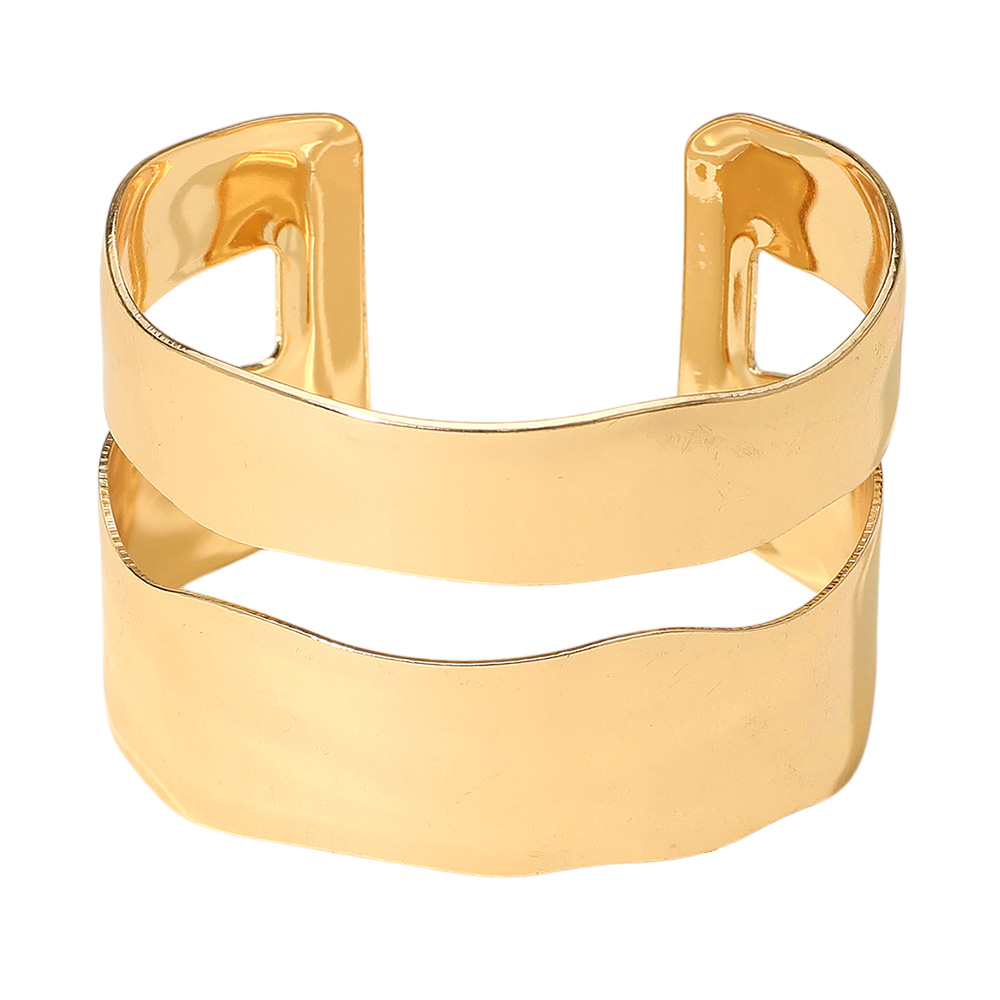 Details • Size : 1.7" H, 2.3" D • Cuff • Bold and contemporary, this wide cuff bracelet features a sleek open band design with smooth, flowing lines for a chic modern look. Perfect for dressing up casual outfits or adding a statement touch to evening wear, this stylish bracelet offers versatility and elegance in one accessory. • Lead and Nickel Compliant