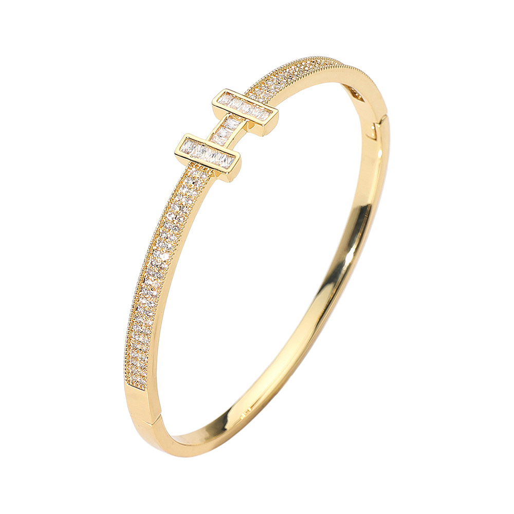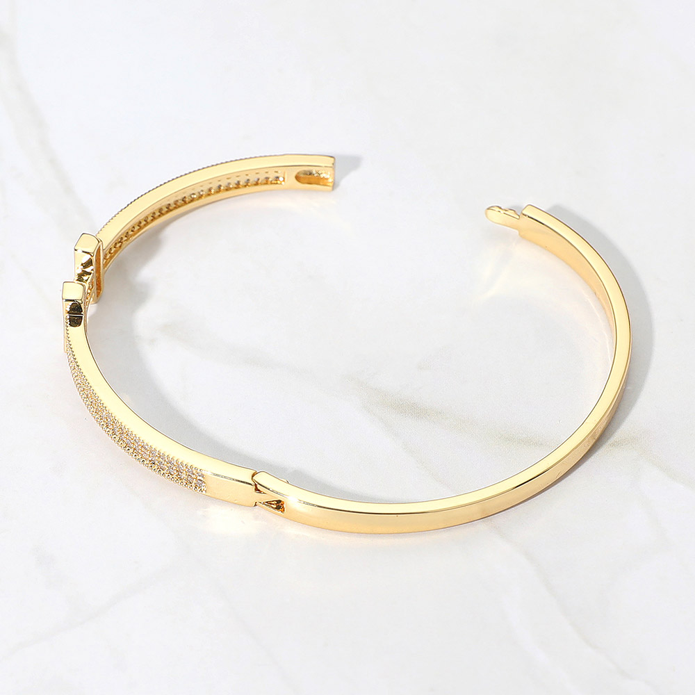 Details • Size : 0.3" H, 2.25" F • Hinged Closure • Shine with sophistication in this geometric crystal bangle bracelet, featuring sleek lines and dazzling accents. Perfect for both formal and everyday wear, its minimalist yet luxurious design adds a touch of elegance and modern flair to any outfit effortlessly. • Gold Dipped
