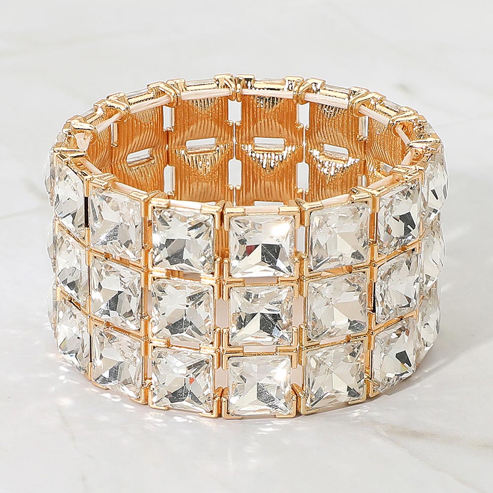Details • Size : 1.5" H, 2.25" D • Stretchable • Make a striking statement with this square-cut crystal stretch bracelet designed for standout brilliance and effortless wear. Its bold, structured layout adds refined sparkle to evening looks or event ensembles, offering a glamorous finishing touch that catches every light beautifully.
