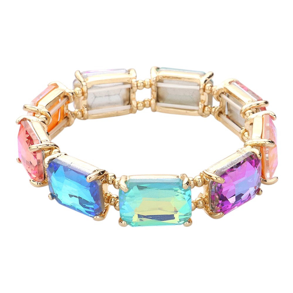 • Elegant emerald-cut crystal stretch bracelet with a faceted gemstone look and gold-tone setting. Perfect for adding a sophisticated sparkle to weddings, parties, or special events.