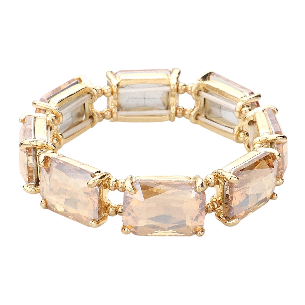 • Elegant emerald-cut crystal stretch bracelet with a faceted gemstone look and gold-tone setting. Perfect for adding a sophisticated sparkle to weddings, parties, or special events.