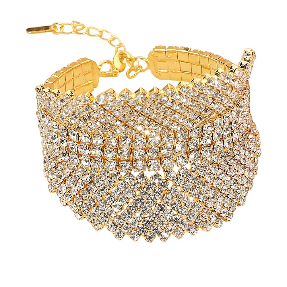 • Add refined sparkle to your look with this layered crystal evening bracelet. Designed with multiple rows of luminous stones that catch every glimmer of light, it exudes timeless sophistication. The adjustable clasp ensures comfort, making it perfect for formal events or chic nights out.