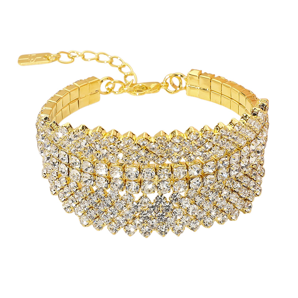 • Make a dazzling impression with this multi-row crystal statement bracelet. Designed with layered rows of radiant stones that catch the light from every angle, it adds a glamorous sparkle to any ensemble. Perfect for formal events, evening wear, or adding shine to a chic everyday look.
