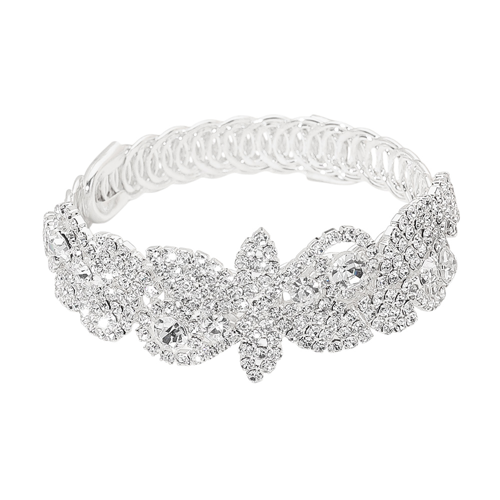• Enhance your elegance with this crystal leaf floral adjustable bracelet. Featuring intricate leaf motifs encrusted with radiant crystals, it sparkles beautifully under any light. The flexible design offers a comfortable fit, making it the perfect statement piece for special occasions or evening wear.