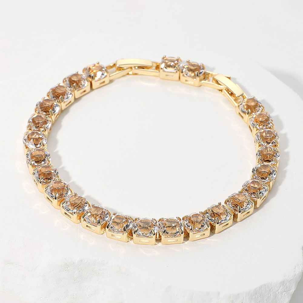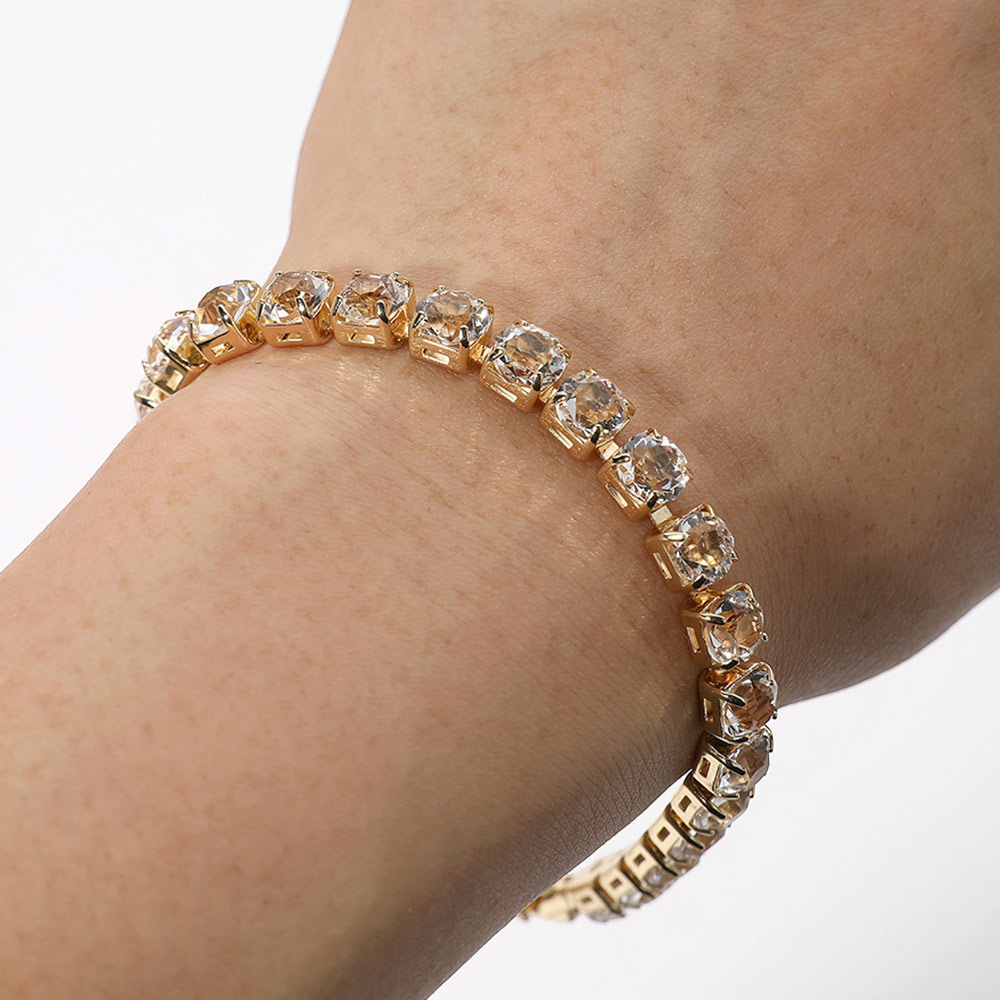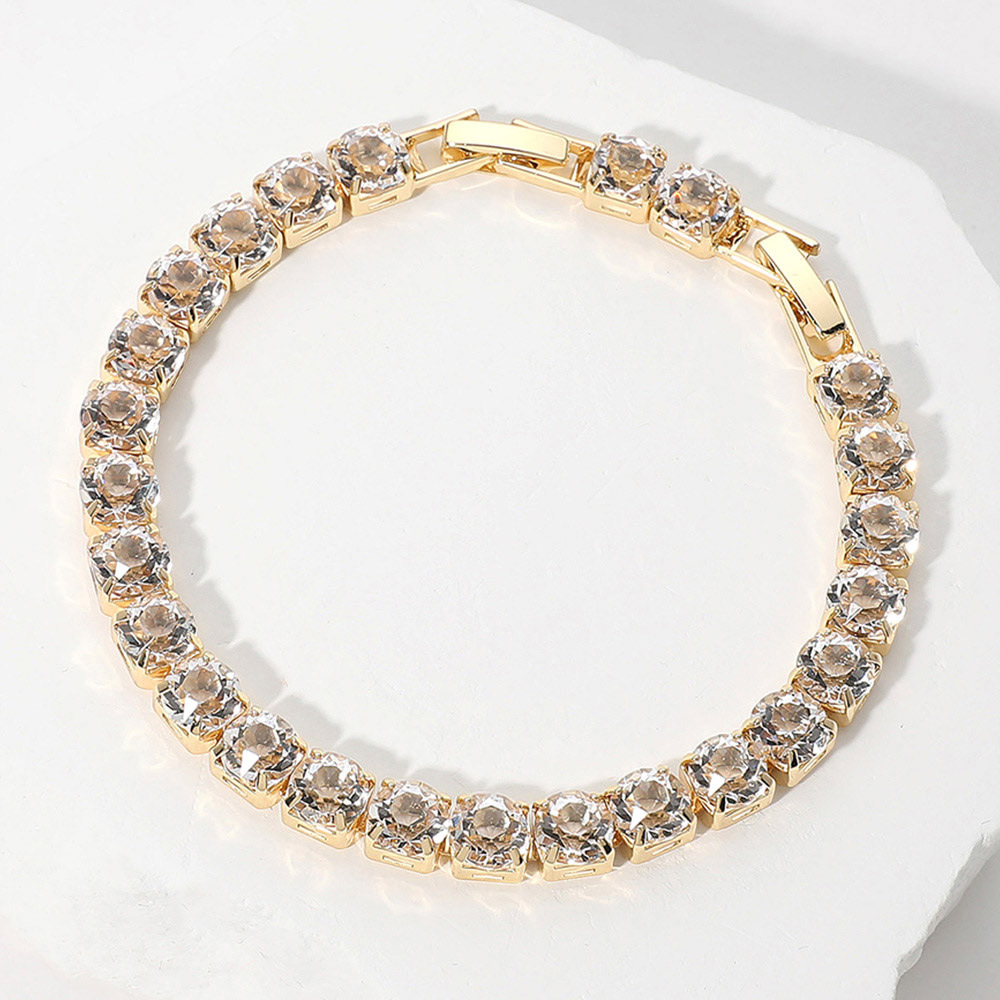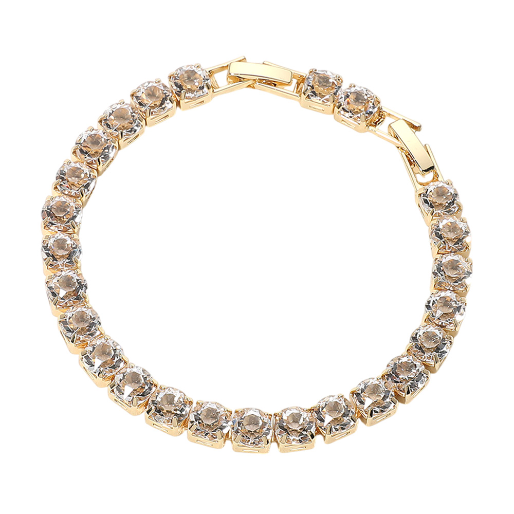 Details • Size : 0.25" H, 7.5" + 0.5" L • Fold Over Closure • Refined and timeless, this crystal tennis bracelet features a row of sparkling round-cut stones set in a polished design. Ideal for elevating everyday attire or adding a hint of glamour to evening ensembles. • Brass