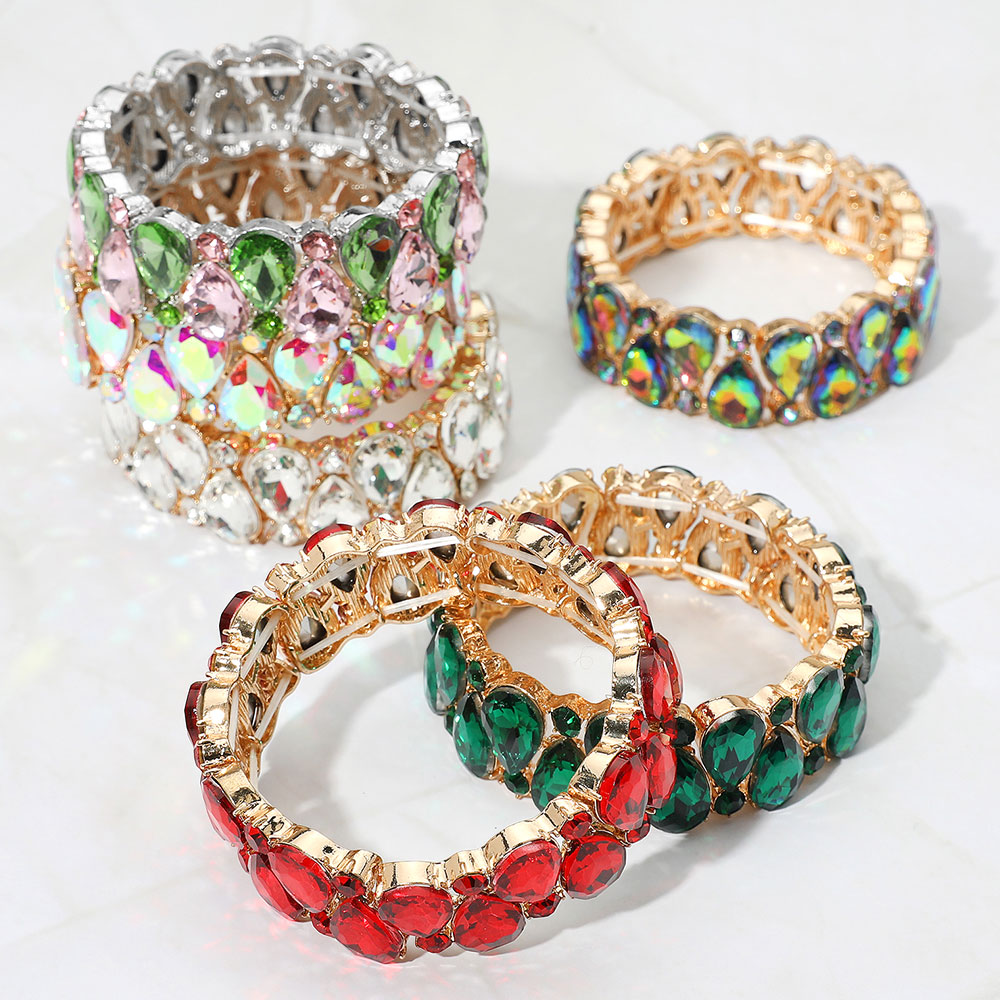 Details • Size : 0.8" H • Stretchable • Elegant stretch bracelet adorned with sparkling teardrop and round gemstones in a bold, eye-catching design. Comfortable to wear and perfect for special occasions, this bracelet adds a touch of glamour to any outfit. • Lead and Nickel Compliant