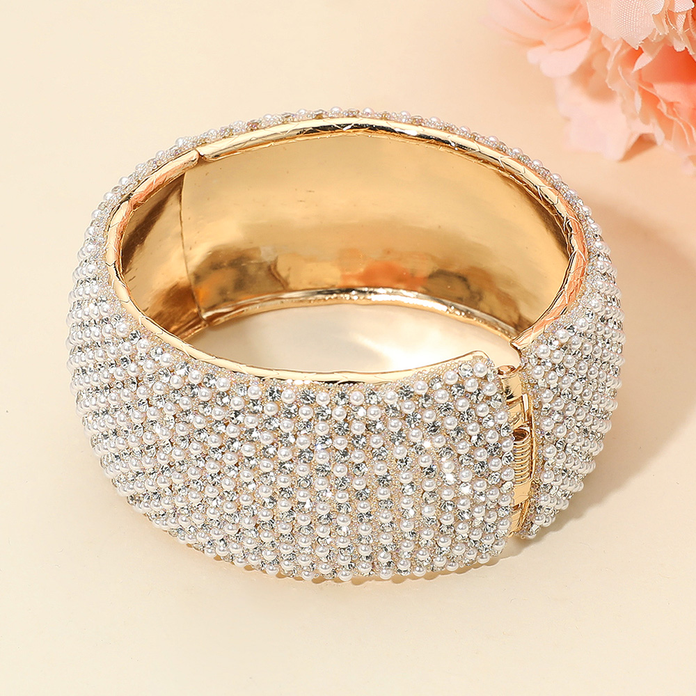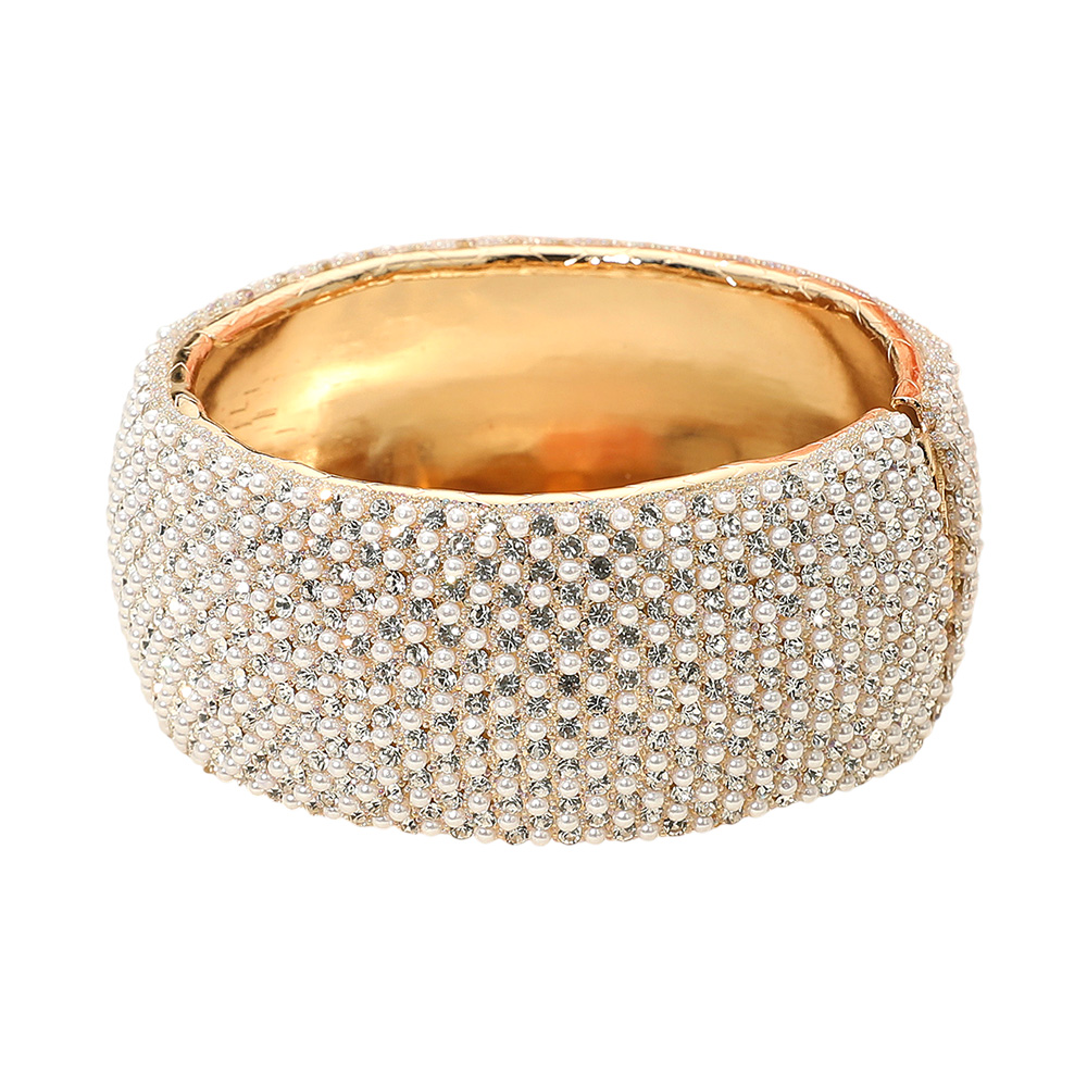 Wide Rhinestone Pearl Paved Hinged Evening Bangle Bracelet