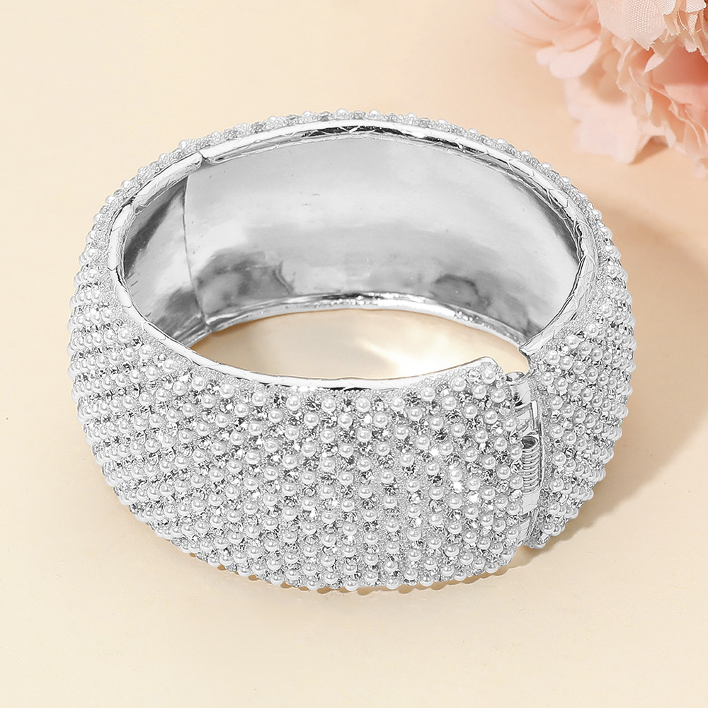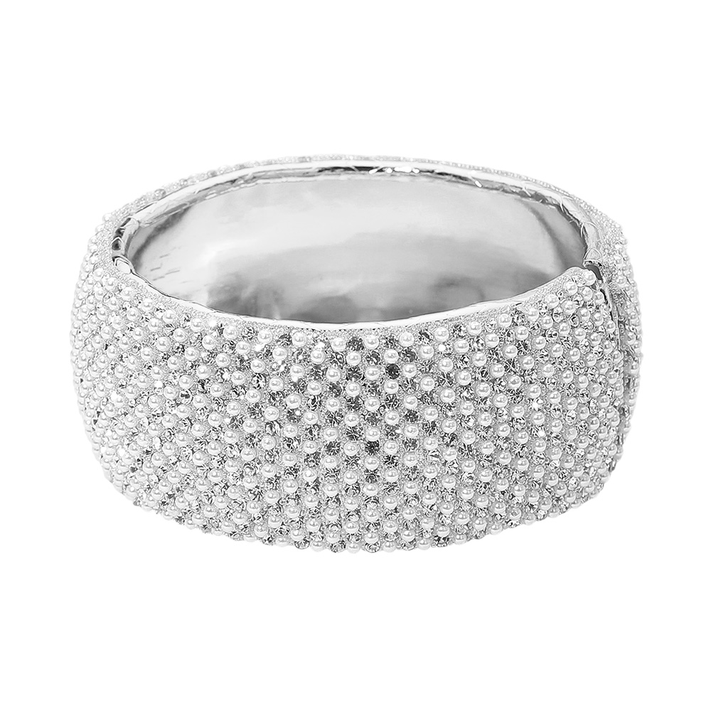• Elevate your look with this wide crystal and pearl pave bracelet featuring a bold, shimmering design. Perfect as a statement bangle for parties, weddings, and special events, this sparkling accessory adds glamour and sophistication to any outfit.