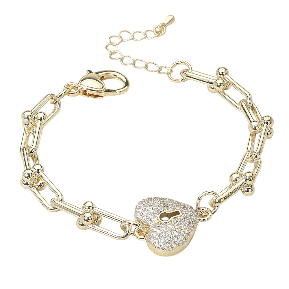 • Showcase elegance with this heart lock charm chain bracelet, featuring a dazzling pavĂ© detail for a radiant touch. The adjustable link design ensures a comfortable fit, making it the perfect accessory to add sparkle to any outfit, whether for everyday wear or special occasions.