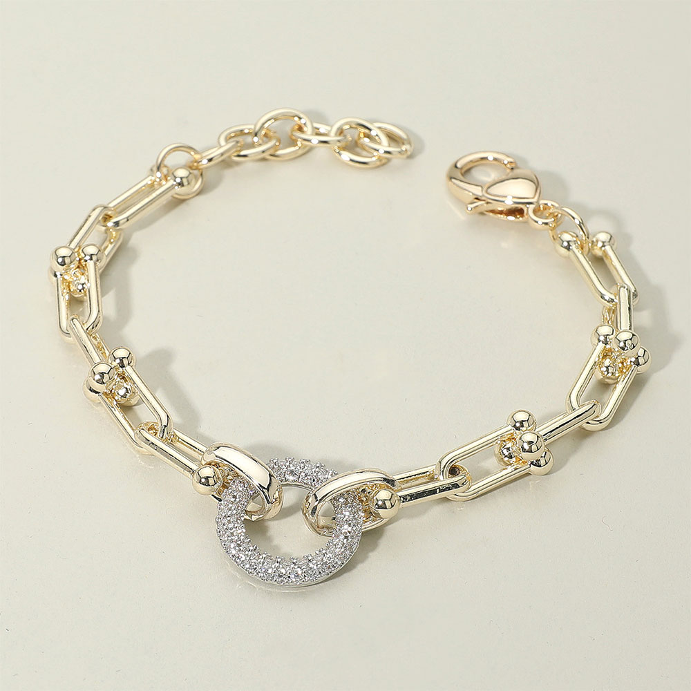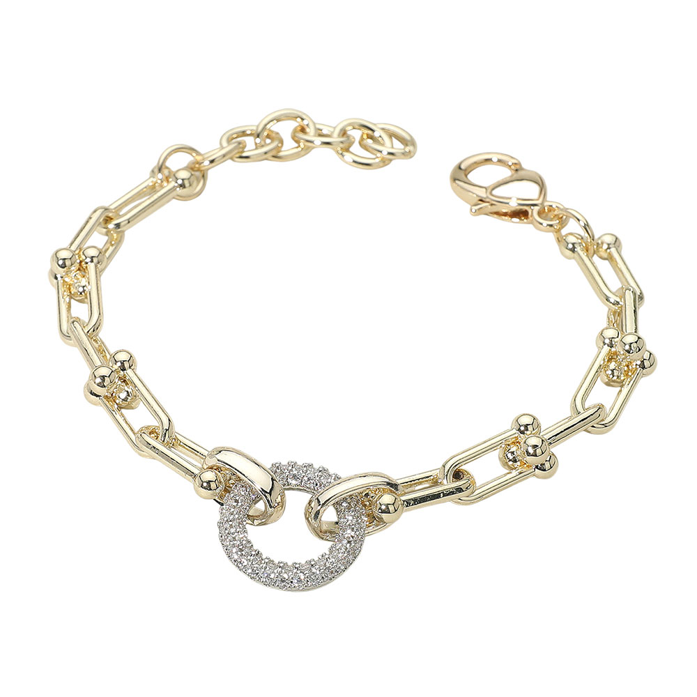 Details • Size : 0.75" H, 7.5" + 1.5" L • Lobster Clasp Closure • Stylish geometric link bracelet featuring bold connectors accented with textured details and a dazzling pave circle charm centerpiece. Perfect for stacking or wearing solo, this bracelet blends modern elegance with timeless appeal, making it a versatile accessory for any jewelry collection. • CZ Cubic Zirconia • Gold Dipped