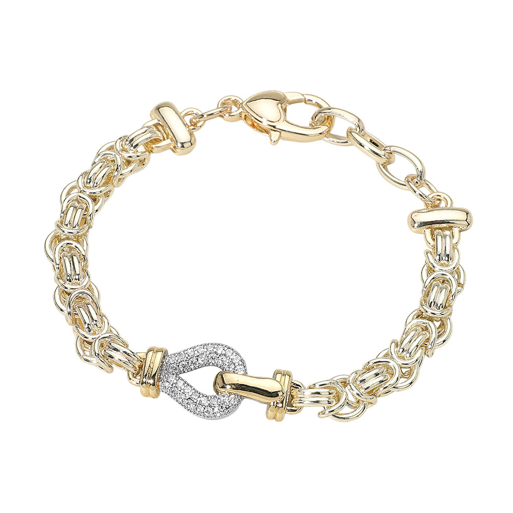 Details • Size : 0.5" H, 7" + 1" L • Lobster Clasp Closure • Chic and timeless, this textured chain bracelet features a refined crystal loop centerpiece that adds subtle sparkle. Designed with intricate links for a sophisticated touch, it’s the perfect piece to elevate any outfit, offering elegance and modern charm in one stunning accessory. • Gold Dipped • CZ Cubic Zirconia