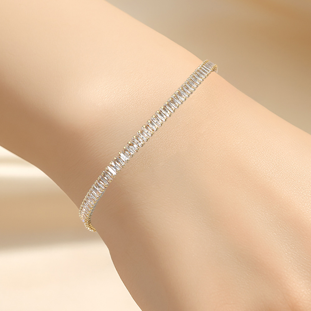 Details • Size : 0.1" H, 6.5" + 1" L • Fold Over Closure • Sophisticated baguette-cut tennis bracelet featuring a sleek row of sparkling stones and a secure clasp. Perfect for adding timeless elegance to any outfit, this bracelet offers refined brilliance and effortless glamour for both special occasions and everyday wear. • Lead and Nickel Compliant • Gold Dipped