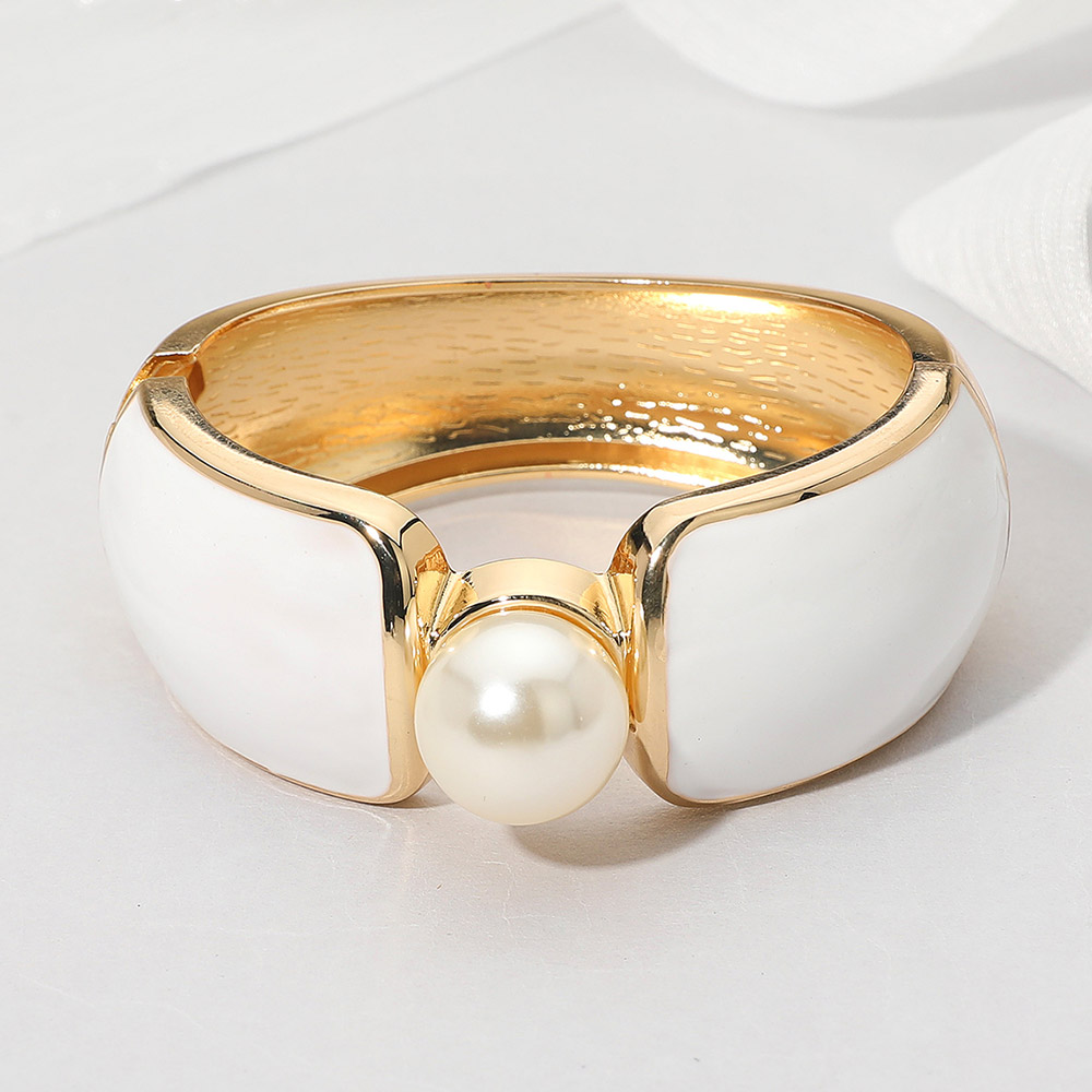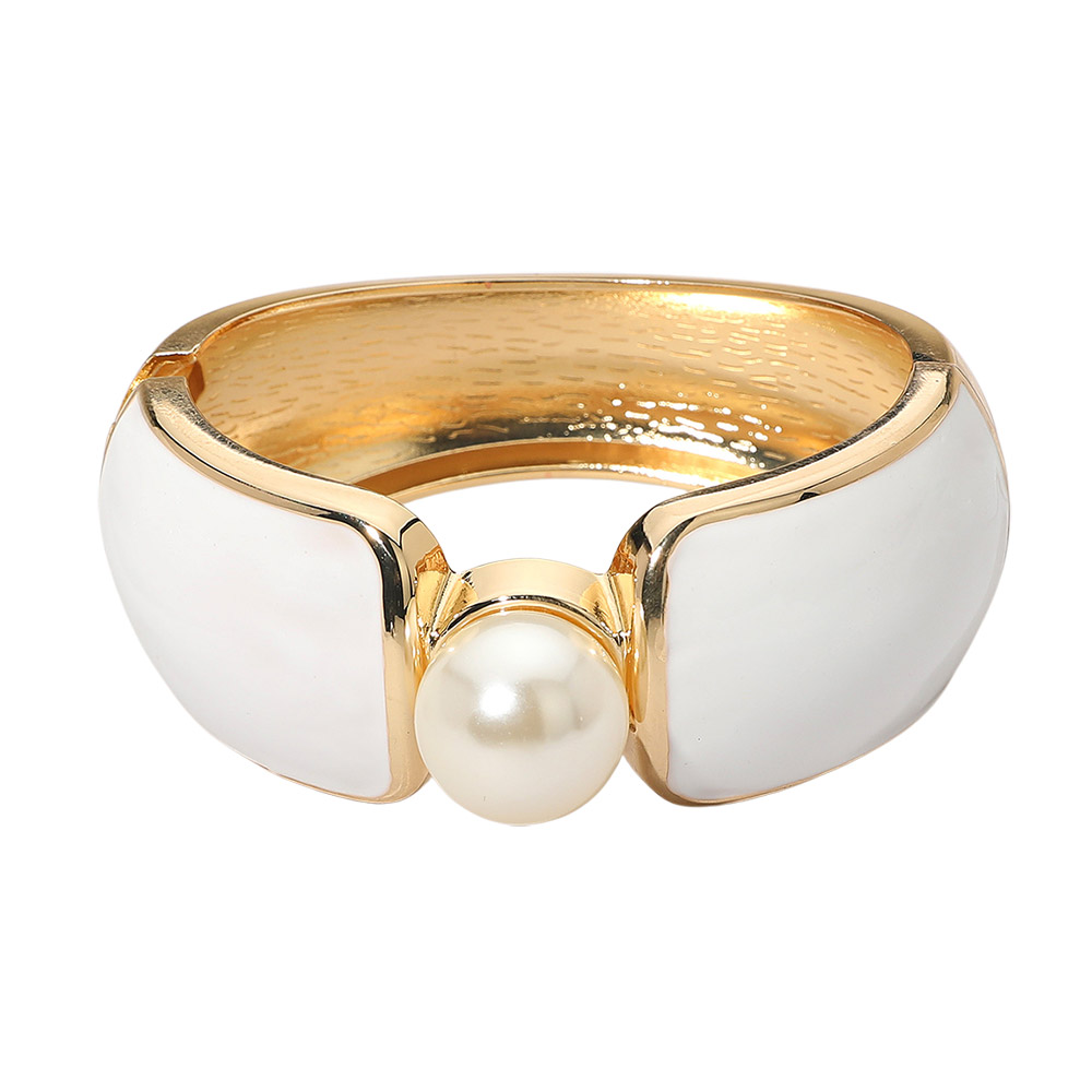Bold Central Pearl Accent Wide Enamel Hinged Bangle Bracelet