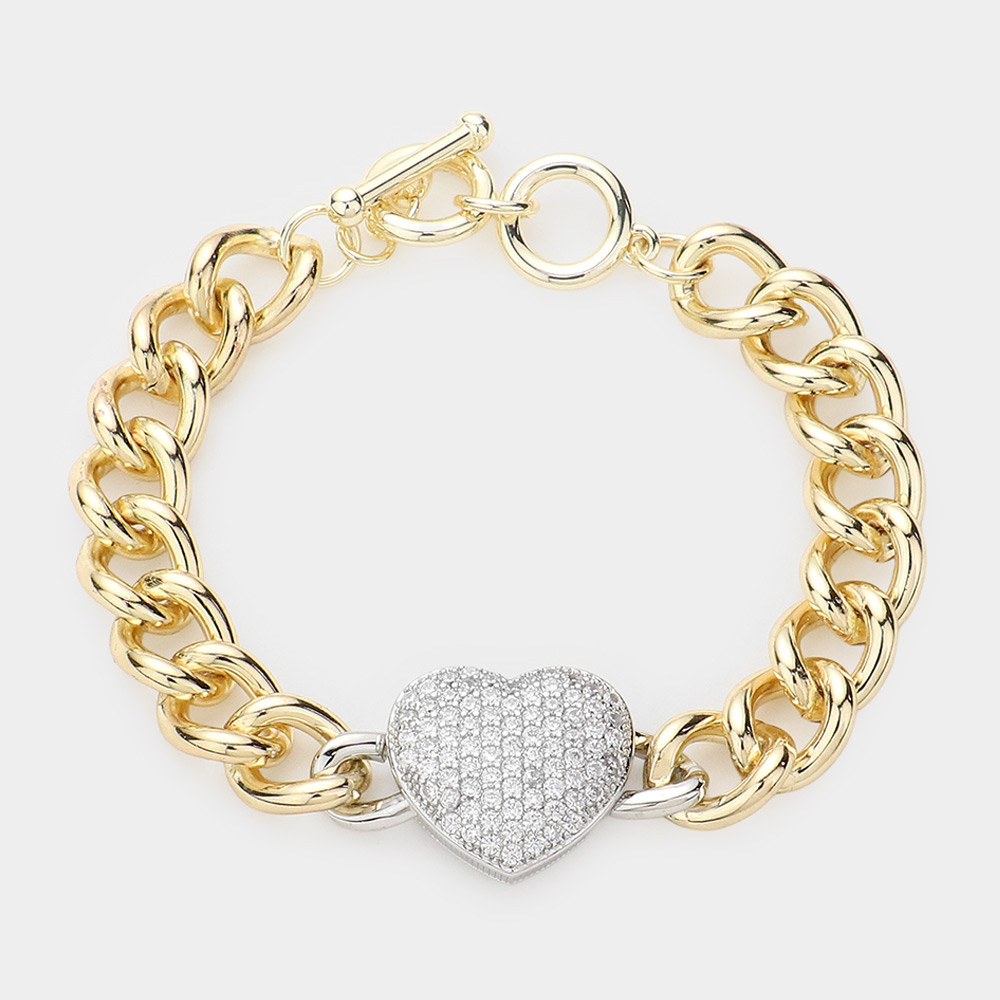 CZ Stone Paved Heart Pendant Accented Chain Toggle Bracelet