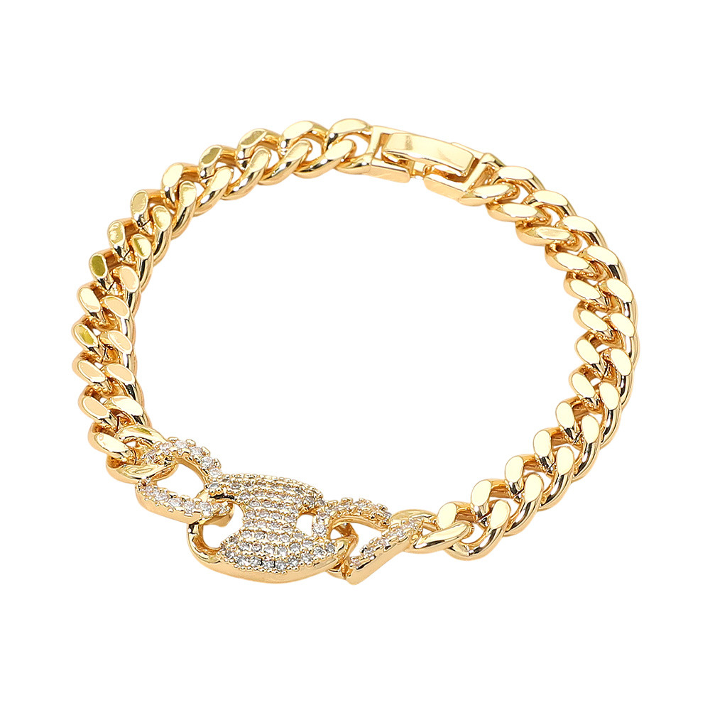 Details • Size : 0.6" H, 7.25" + 0.3" L • Fold Over Closure • Stylish Cuban link bracelet featuring a polished chain design with a sparkling clasp accent. Perfect for both casual and formal wear, this bracelet offers timeless appeal with a touch of glamour. A versatile accessory that enhances your jewelry collection with bold and elegant style. • Brass • CZ Cubic Zirconia • Lead and Nickel Compliant