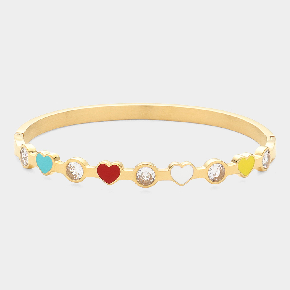 Enamel Heart Stone Bezel Pointed Stainless Steel Hinged Bangle Bracelet