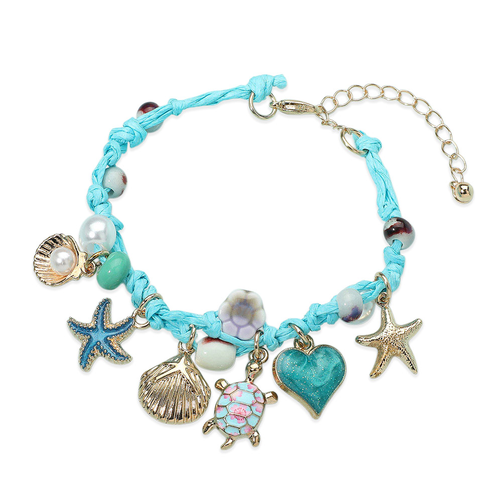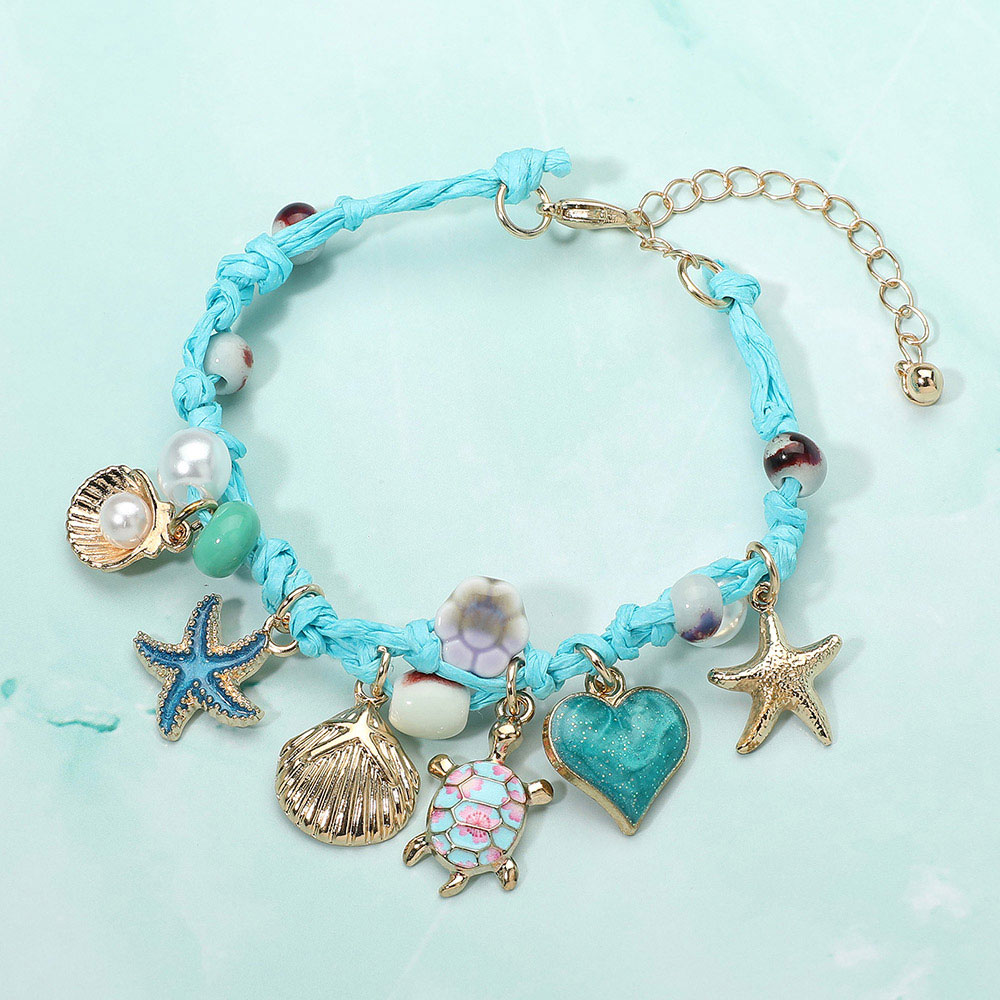 Enamel Starfish Turtle Metal Pearl Seashell Heart Charm Ceramic Flower Pearl Beaded Raffia Bracelet
